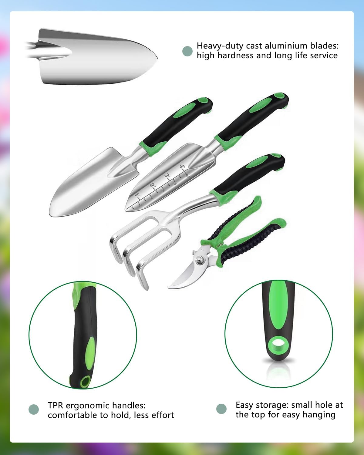 Fully Accessorised 10-piece Set: 10PCS garden tools set-ncludes Weeder, Hand Rake, Transplanter ,Hand Cultivator ,Trowel Pruner and garden tote storage bag, Plant Repotting Mat , Spray Bottle. Nearly everything you need in daily garden maintenance. The ideal garden gift set for those who love outdoor gardening.