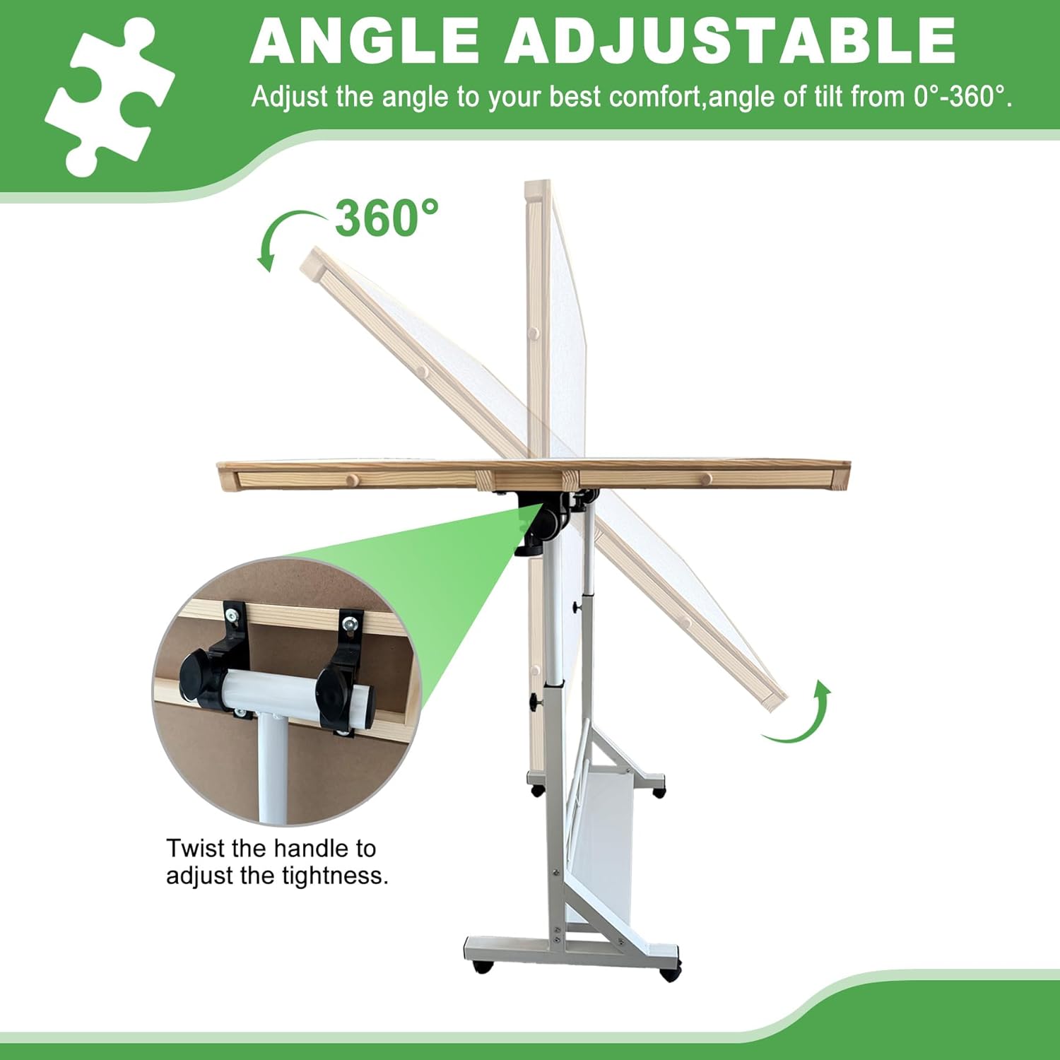 【Adjustable Angle and Height】The height of jigsaw puzzle table with Legs can be adjusted between 25.5 ~ 35.4 in and the tabletop can be setup at several tilt angles. Find a best combination of height and tilt angle to avoid a stiff neck and stressed back while enjoying puzzling. Just flip the desktop by 90° when you don’t need it and place it against the wall to save space.