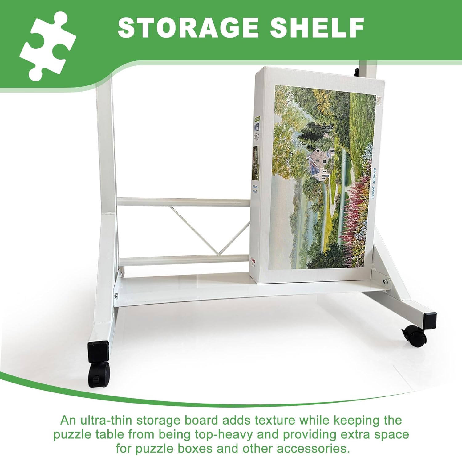 【4 Universal Wheels & A Storage Rack】4 wheels are designed lockable to help immobilize and stabilize the whole construction, while the bottom shelf offers extra space for puzzle boxes and other accessories.