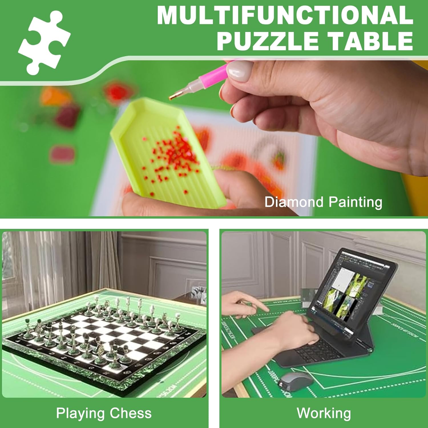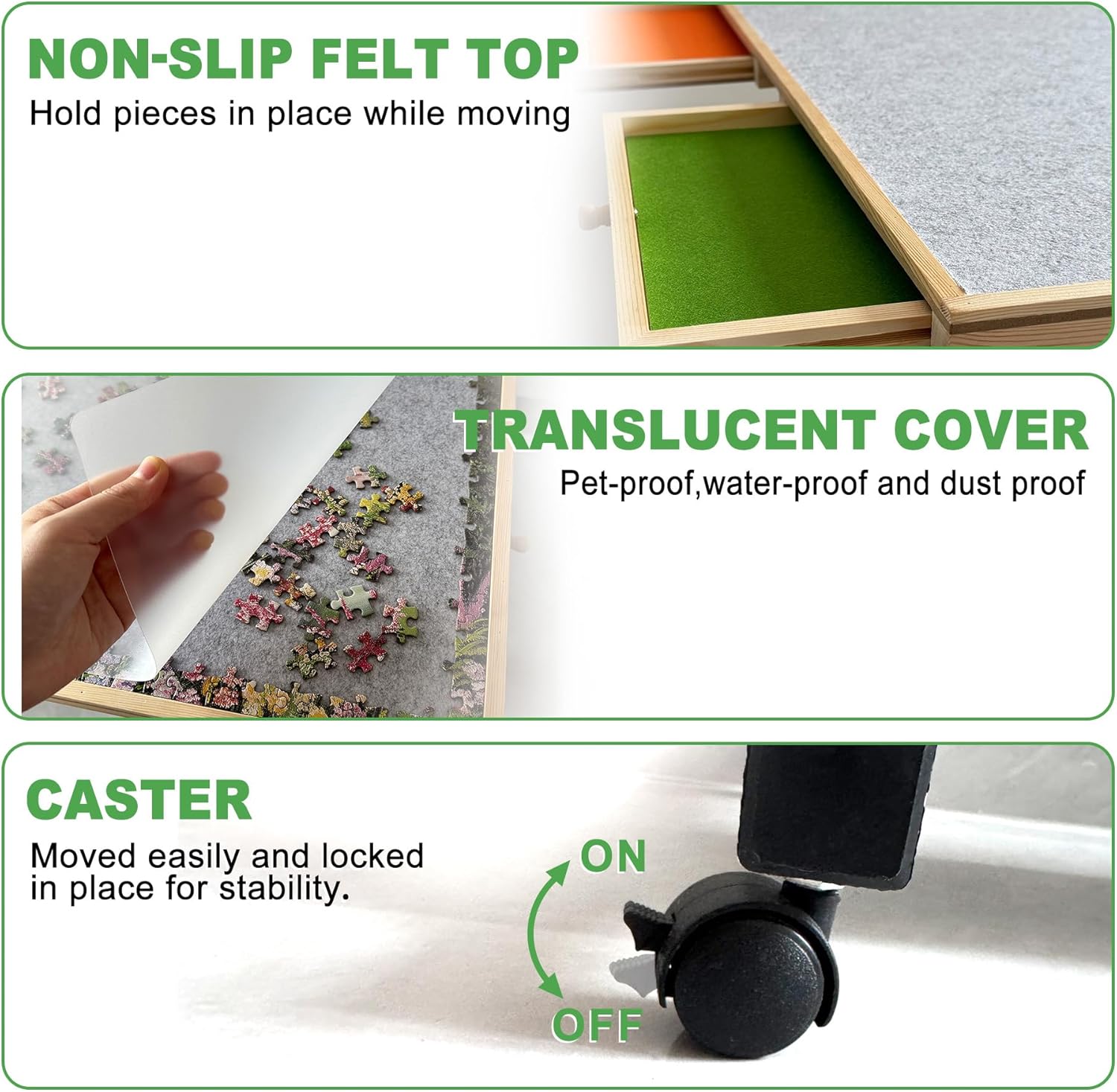 【Quality Material & Light-hearted Installation】Constructed by a strong metal frame, pinewood panels and P2 grade particleboard, sturdy and durable. Usable area measures 34.2 × 26.2 in to make it fit most 1500 pieces jigsaw puzzle games. Tabletop is covered with soft suede to offer a comfortable texture and ensure enough friction to stop puzzle pieces from sliding and falling.