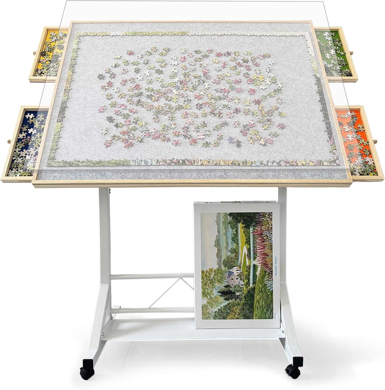 【4 Drawers and 1 Protective Cover】4 drawers lines in unique colors are included to ensure you with higher game efficiency by allowing you to sort puzzle pieces by the color, shape or pattern.This puzzle table with drawers featuring a translucent cover, which can well guard your masterpiece from dust, water and your cat too.
