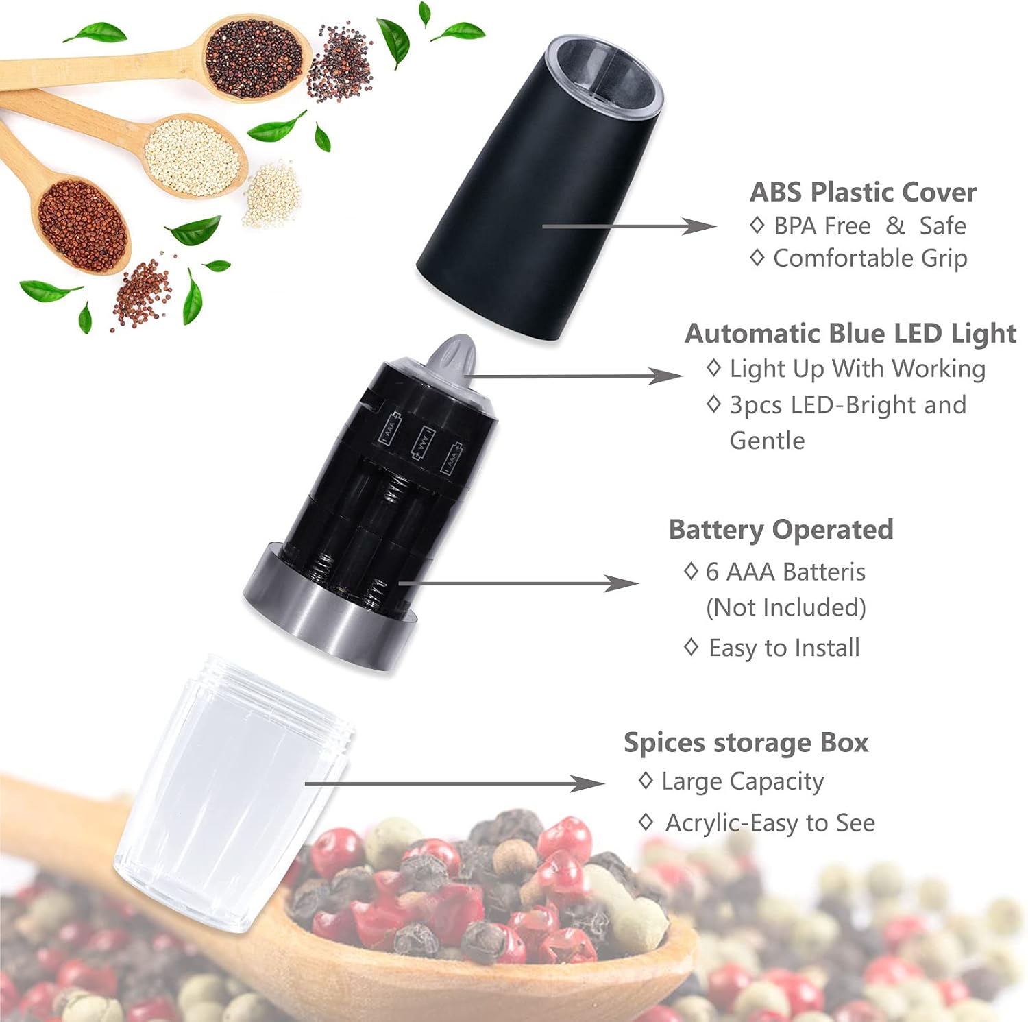 【Automatic Operation】:Our pepper grinder adopts advanced gravity sensing design, No need manual grinding, no buttons to press.Simply flipped the grinder and you will have fresh ground spices.Allows you to activate the distribution of your favorite spices with one hand, while the other hand is free to handle other kitchen tasks.