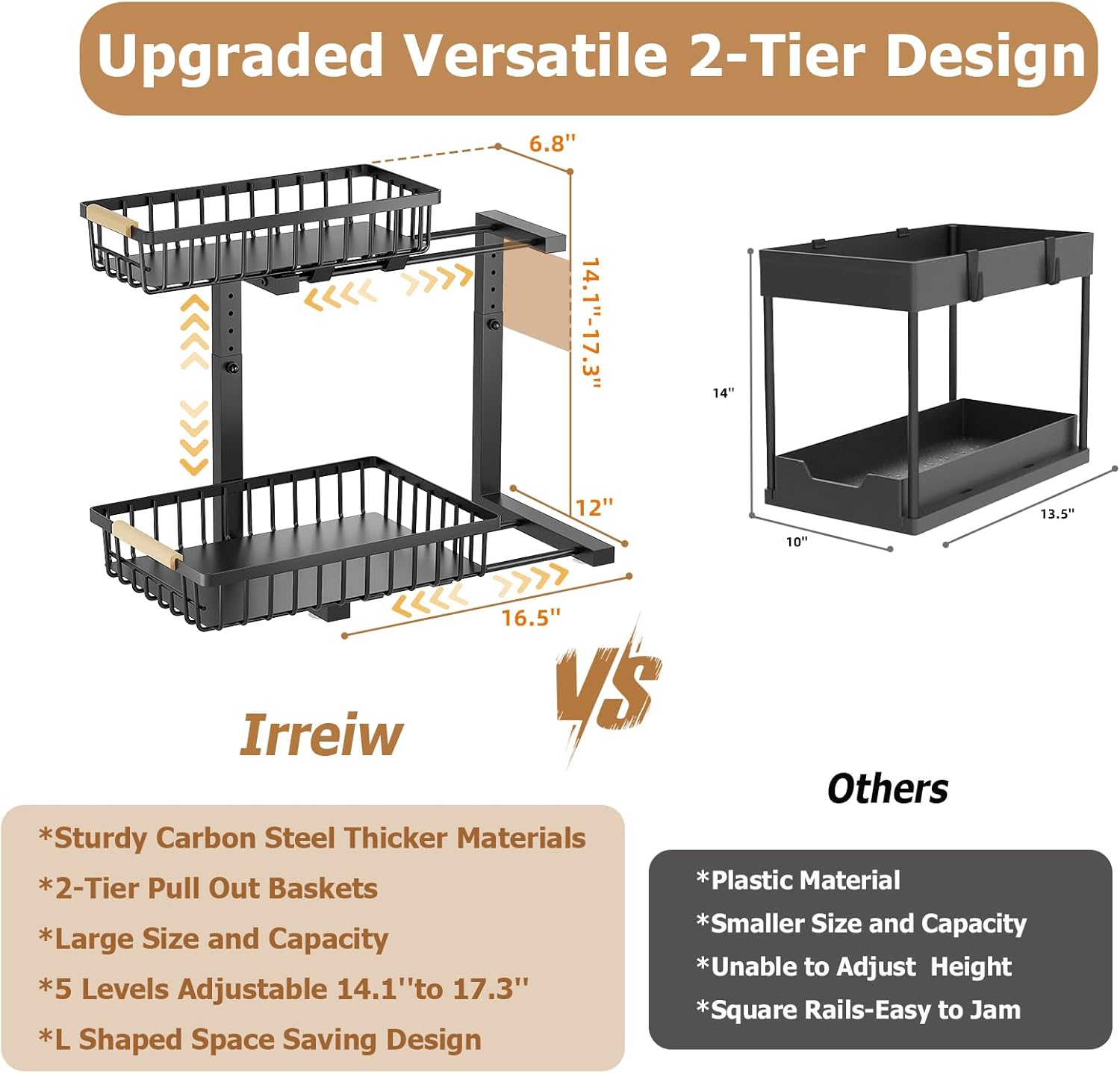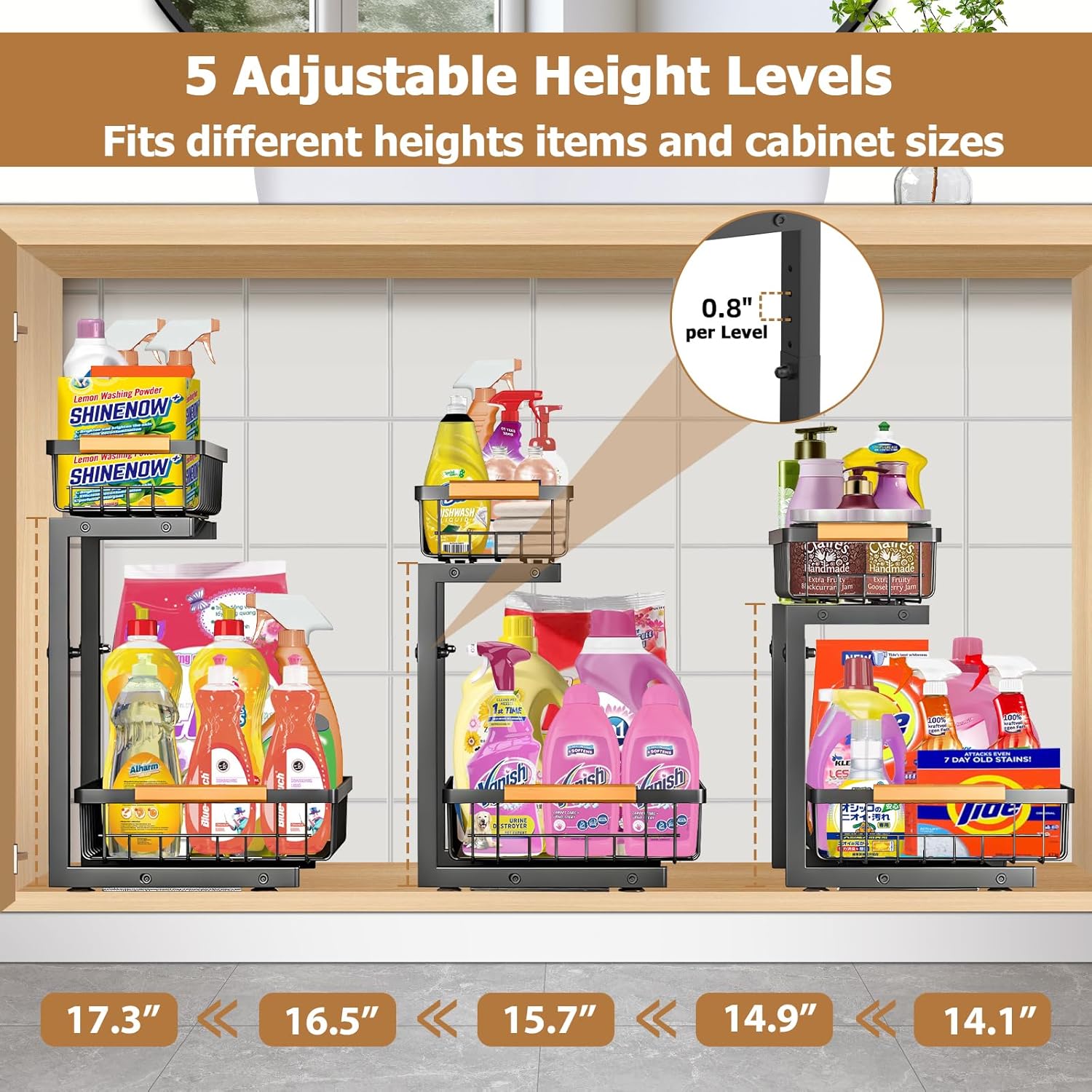 【Upgraded 5-Level Height Adjustable】 With 5 adjustable height settings (from 14″ to 17″), this bathroom storage adaptable to various cabinet sizes, ideal for your kitchen and bathroom use. Helping you keep your items neatly organized under the sink