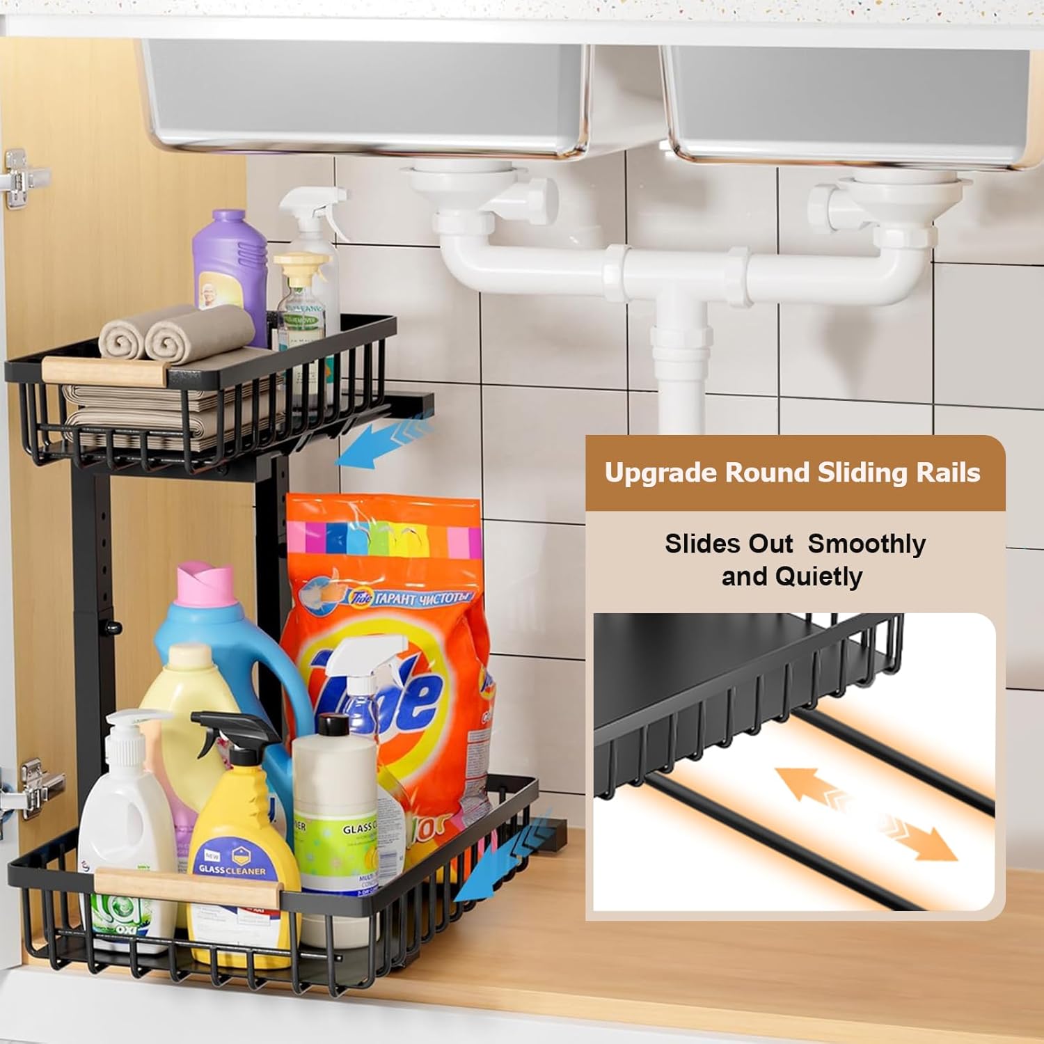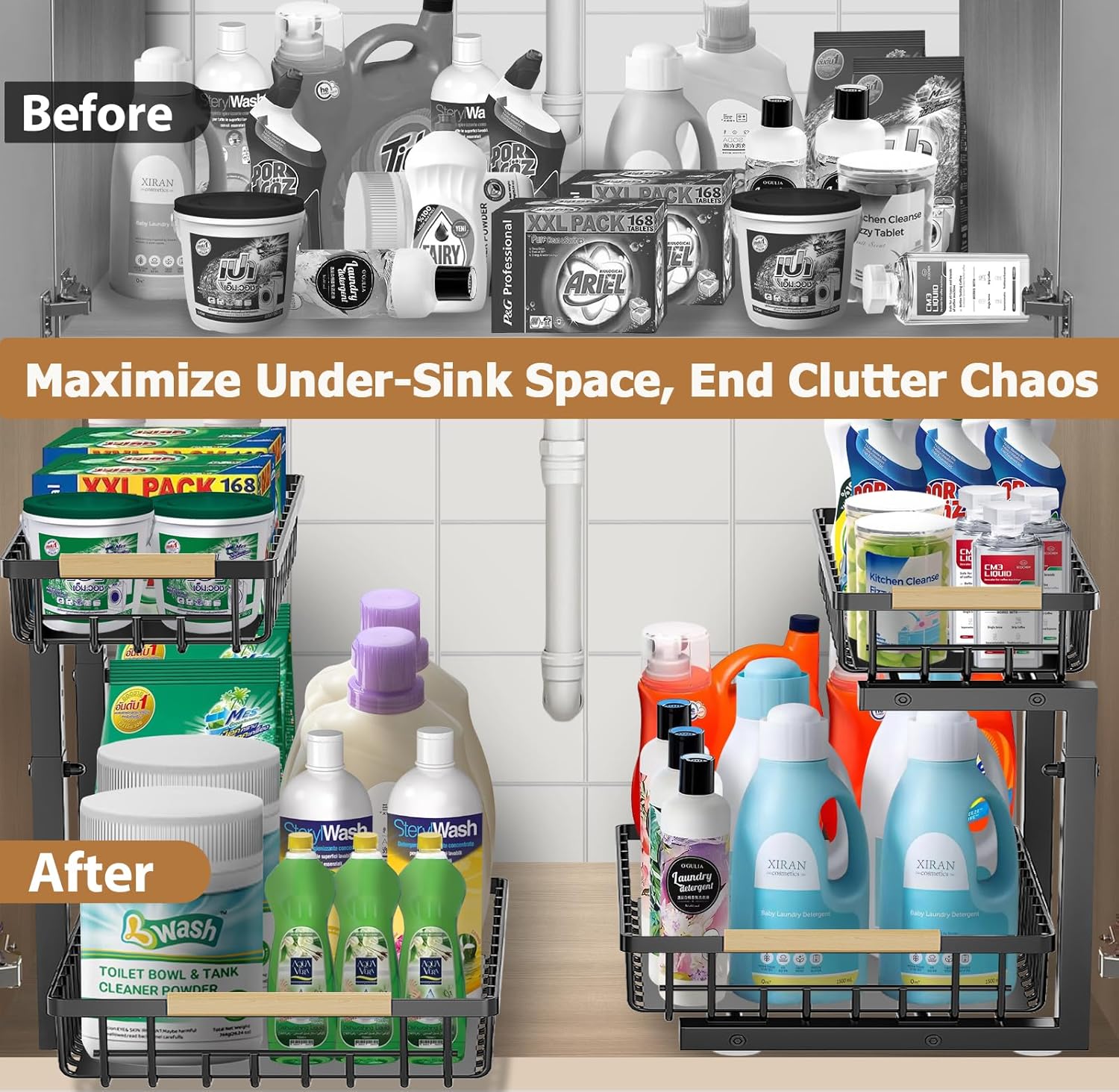 【L-Shaped Space Optimization Design】Maximize under sink storage efficiency with our innovative L-shaped under sink organizer! Narrow top tier creates clearance for sink plumbing pipes, expanded lower tier accommodates tall bottles storage. Doubles cabinet storage capacity while maintaining easy pipe access