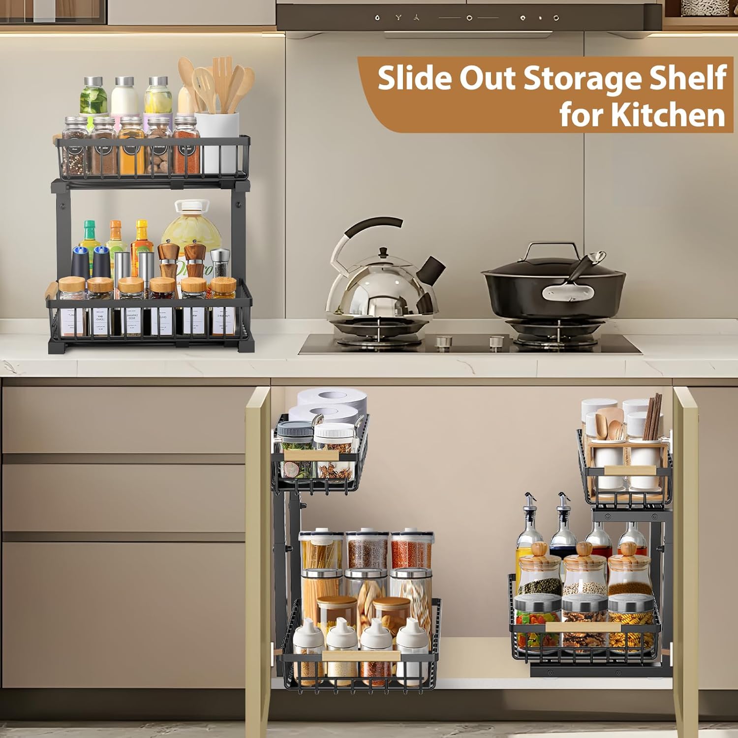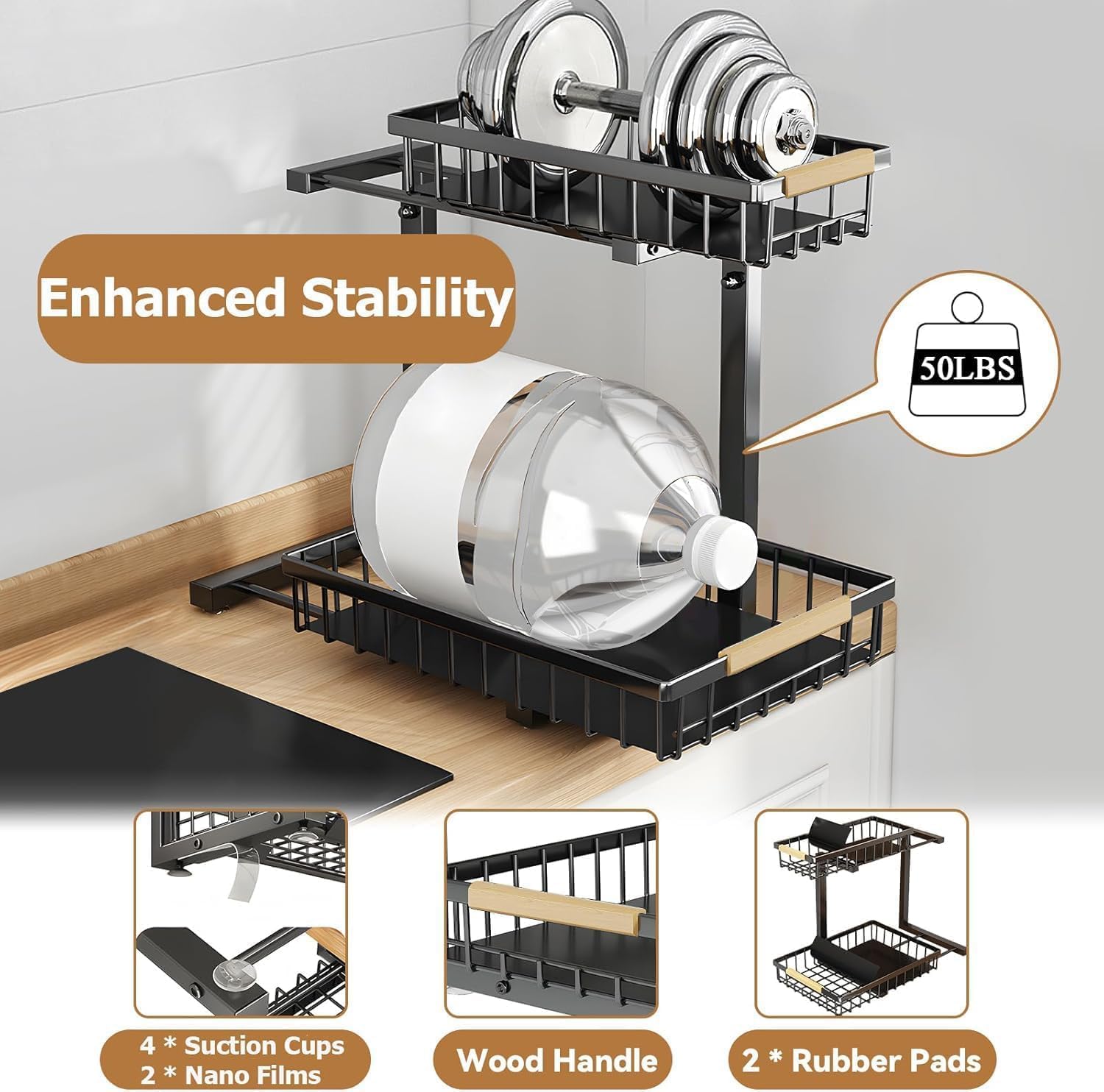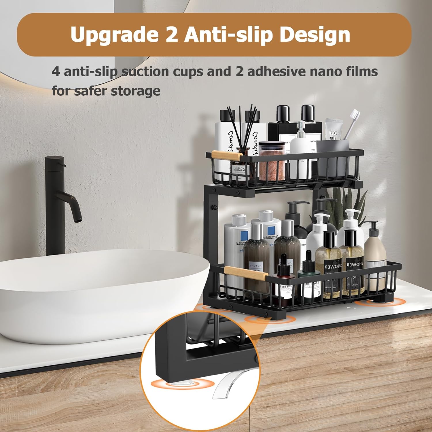 【Thicker Materials & Stability】This under kitchen sink organizer is built with thickened carbon steel frame and anti-rust coating, ensures more stable kitchen organizers and storage can supporting up to 50 lbs capacity. Equipped with 4 suction cups and 2 nano adhesive films prevents wobbling and slipping out, perfect for kitchen cabinet organizer