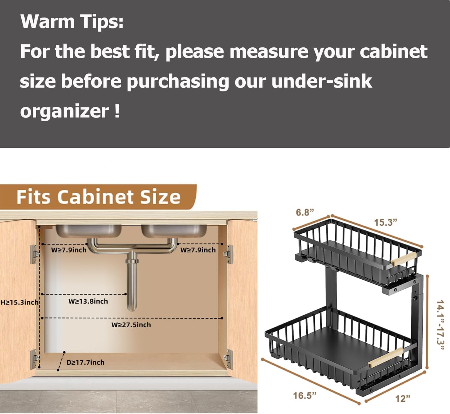 【2-Tier Sliding Storage Drawer】The pull out cabinet organizer with 2-Tier sliding design, drawers with wood handles can be pulled out smoothly, effortless access to stored items. Upper Basket: 15.3″L x 6.8″W x 2.5″H, Lower Basket: 16.5″L x 12″W x 3.3″H. Recommendation: Verify cabinet dimensions before purchase to ensure this bathroom organizers and storage compatibility