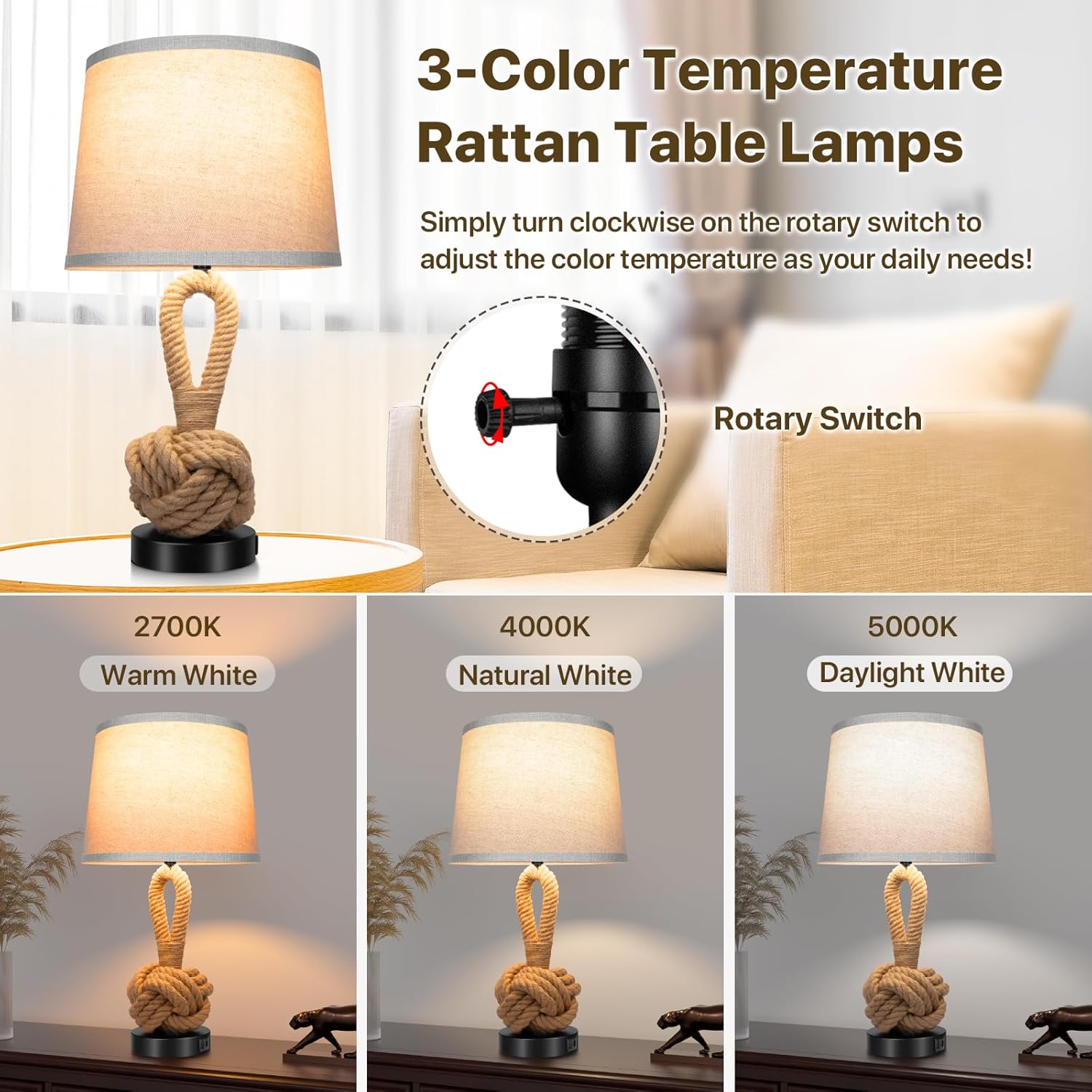 2pcs LED Bulbs Included: We have provided two free LED bulbs worth $12 for our boho lamps for bedroom. These two 800 lumens E26 9W LED bulbs are equivalent to 100W incandescent bulbs and have three color temperature functions, which are more energy-efficient. Choosing our rattan table lamps set of 2 will greatly save your time and money in purchasing additional light bulbs