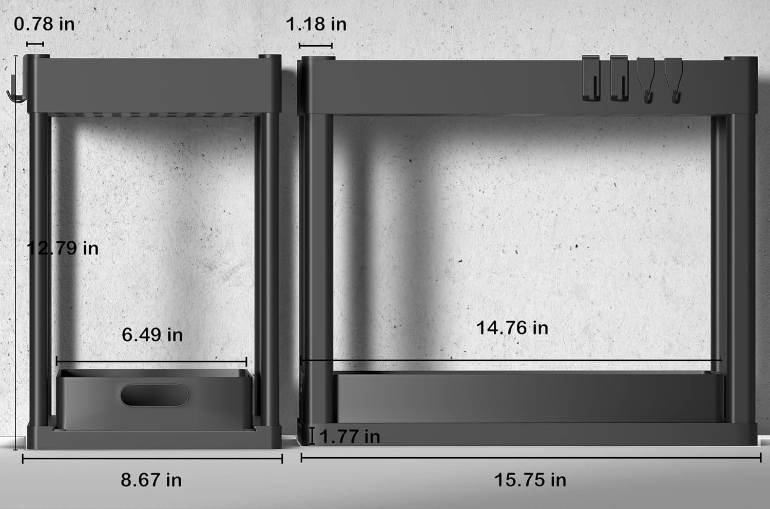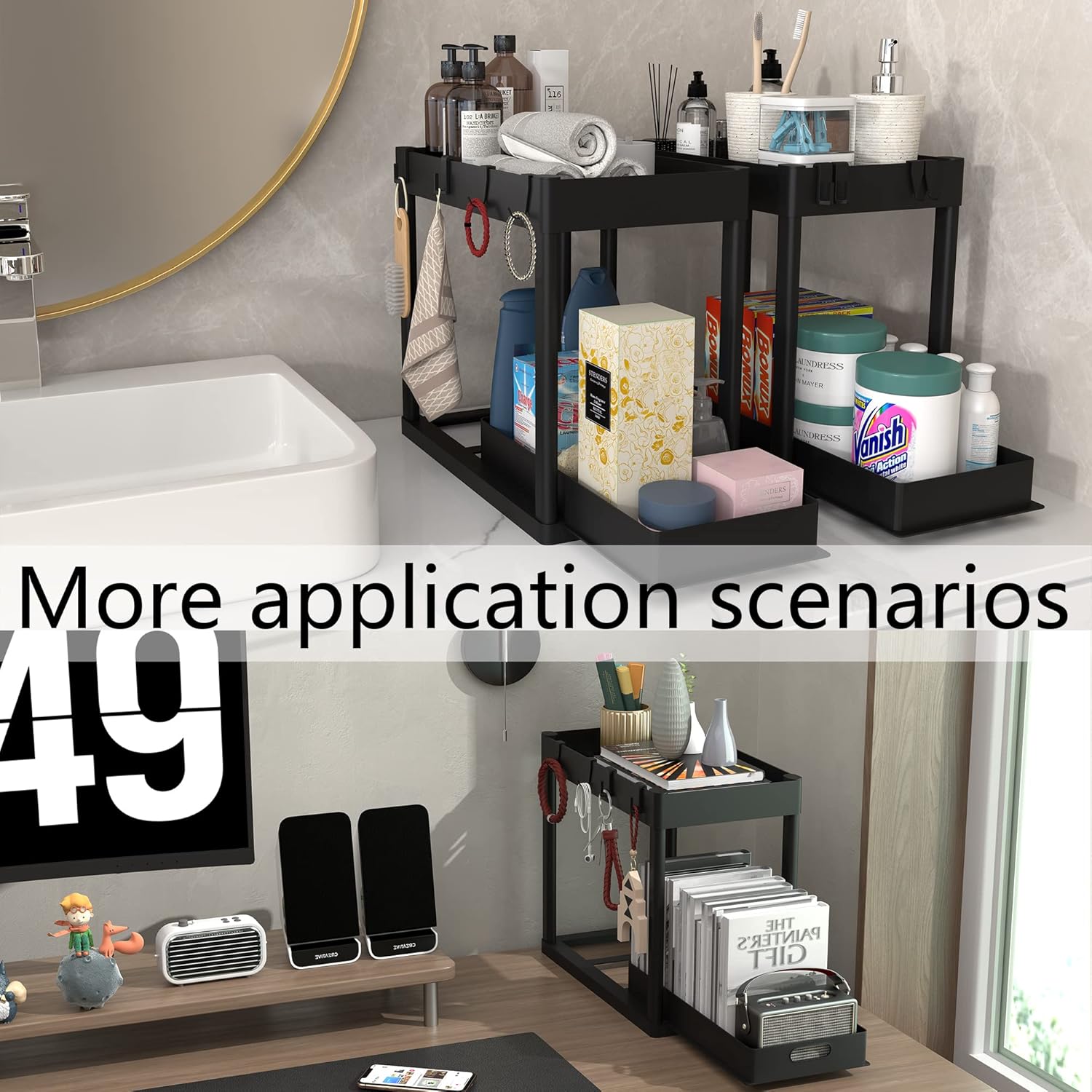 Multi-Purpose Organization and Storage: The under sink shelf organizer can effectively save your space and is easy to move. Suitable for various scenarios such as kitchen, bathroom, garage, laundry room, office, etc