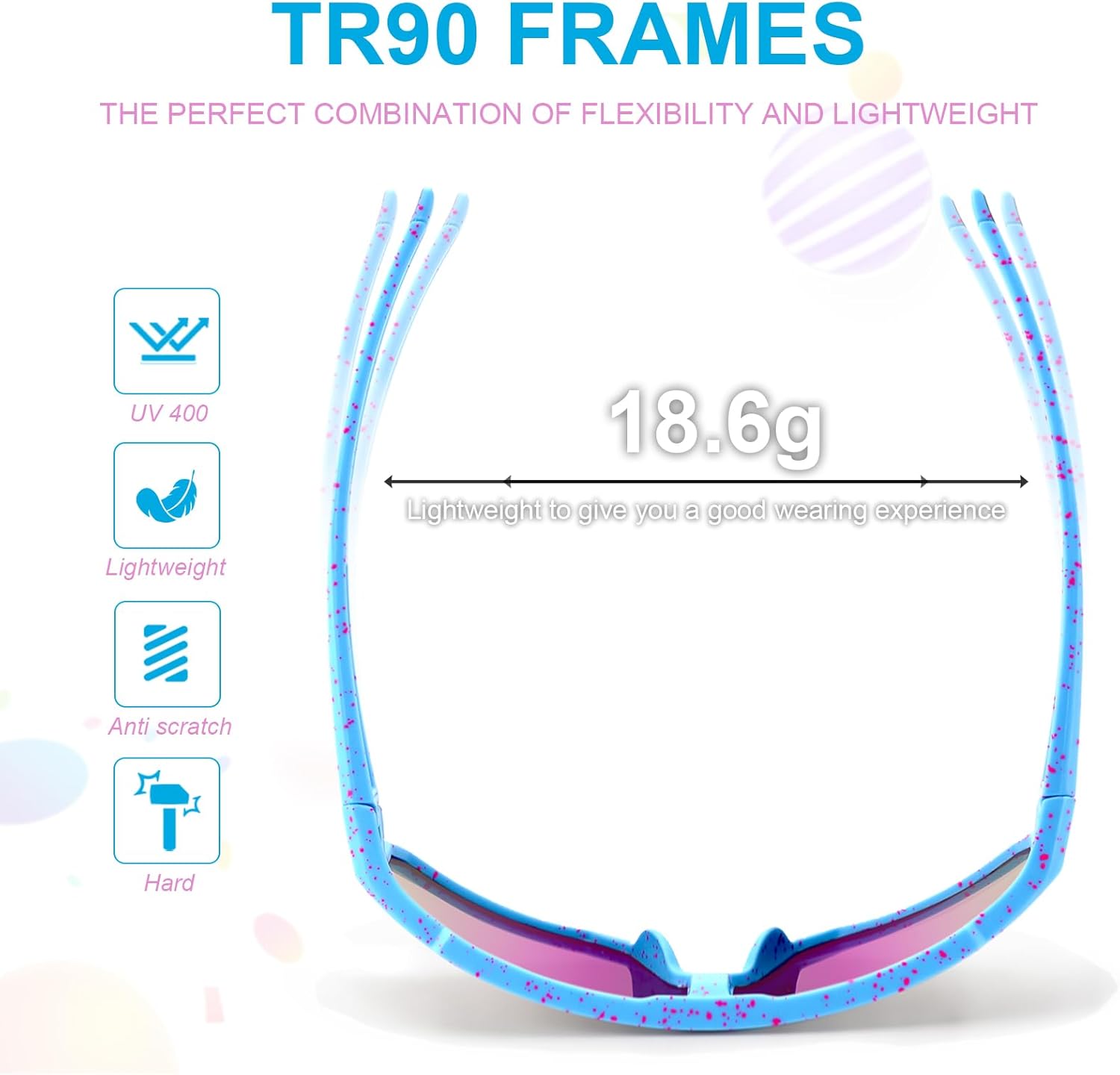 Ulral Light TR90 Freme:The youth sports sunglasses weigh only 18.6g, it is comfortable to wear and can withstand the rigors of sports, cycling, and other activities. Ideal polarized sunglasses for baseball, softball, climbing, driving, fishing, golf, hiking, running skiing, cycling and so on.