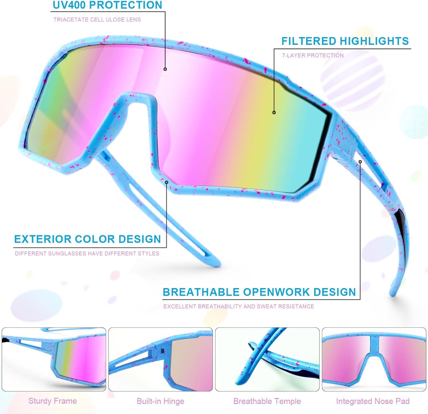 Polarization & UV Protection:Equipped with HD lenses and advanced coatings, these youth baseball sunglasses provide 100% UV protection,keeping eyes safe during sunny park trips, beach days, or outdoor play. Let them explore the world without worrying about harmful rays.