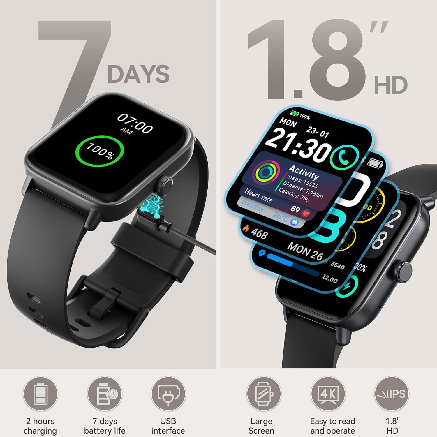 【Long Battery Life & Versatile Functions】Powered by a high-capacity 350mAh battery, Aeac smart watch for women iphone fully charges in just 2 hours for 14 days of use. Aeac fitness tracker compatible with iOS and Android smartphones. This samsung smart watch for men android also equipped other functions, such as weather forecasts, alarm clocks, control camera, music control and more