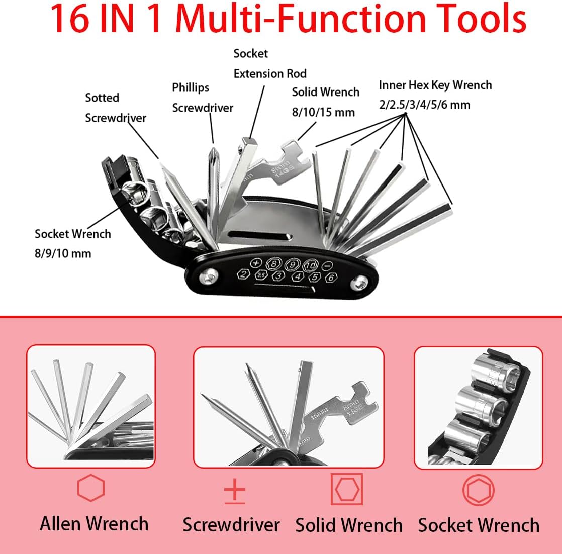 16-in-1 Bike Multitool:The foldable multi-function bicycle tool is made of high-quality stainless steel, sturdy and durable. includes Hex key (mm): 2 | 2.5 | 3 | 4 | 5 | 6 , Socket Wrench (mm): 8 | 9 | 10 and a Extension Rod, Flat Wrench (mm): 8 | 10 | 15, 14GE rim accessory wrench, Slot driver, and Phillips Cross Drive.