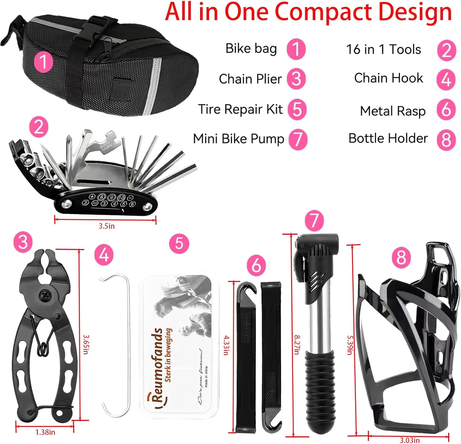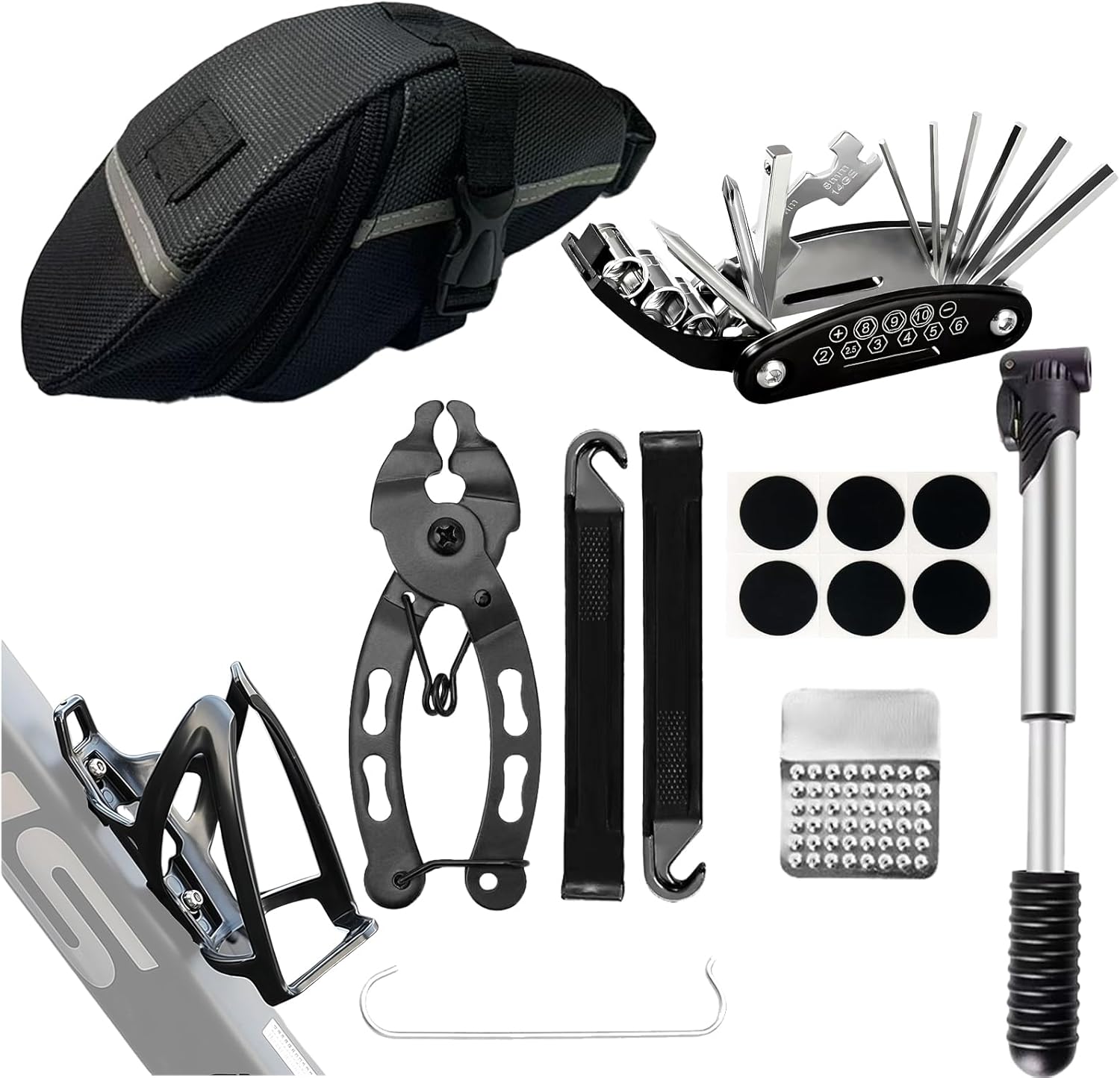 Specialized Bike Accessories:Bicycle accessories include a bike seat bag ,120psi bicycle pump, 16 in 1 multi-function bicycle multitool, bike chain tool,bike patch kit, metal rasp, and bike tire levers. All the accessories can be held in the bicycle storage bag, which makes your riding and travelling without troubles.Ensure safety in a harsh environment and immediately continues to ride without danger.