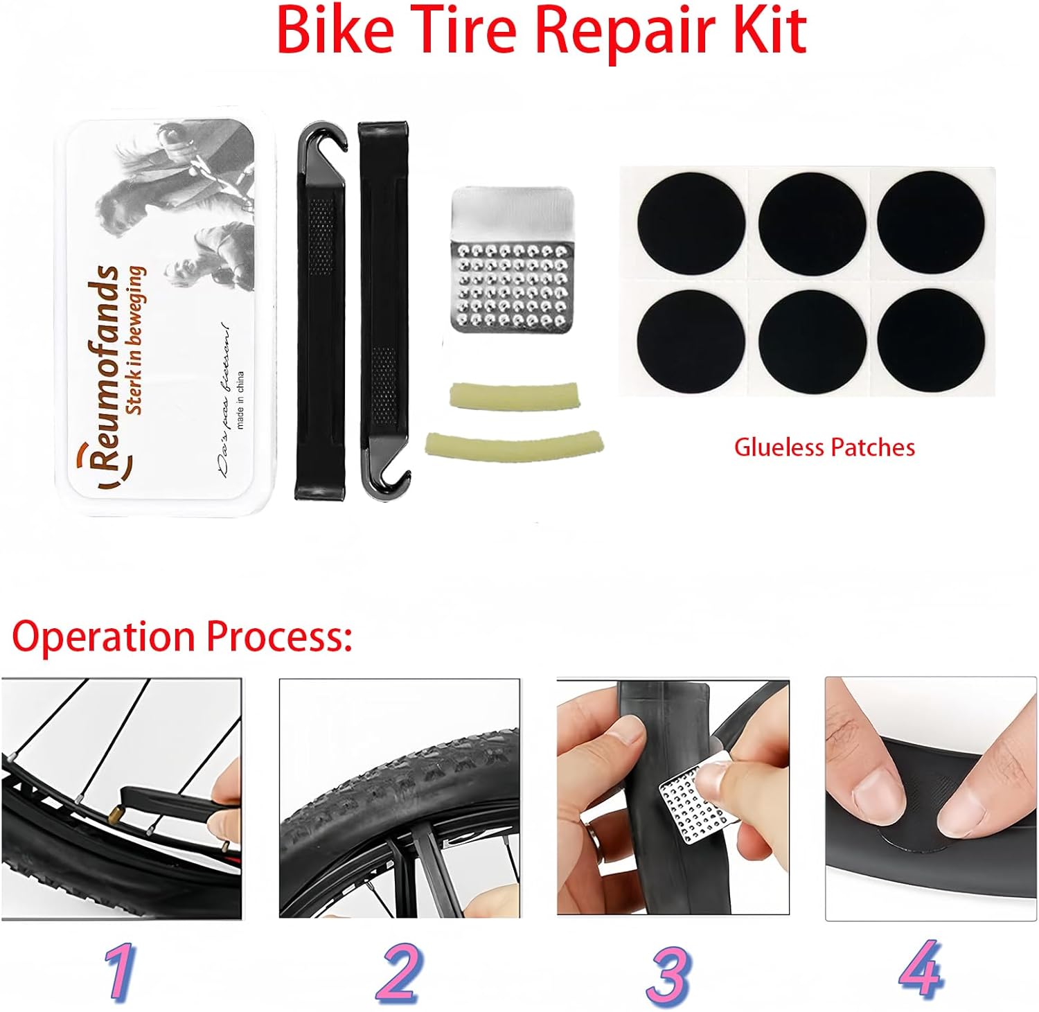 Bike Tire Repair Kit: 6 self-adhesive instant repair patches get prepared for a flat tire, which was designed to help outdoor cyclists to get out of trouble easily in the jungle and on the road at any time. Simply use 2 tire pry bars remove the inner tube, apply the rasp to rough it, and paste the self-adhesive patch firmly on the damaged area. A strong helper to repair and change a flat bicycle tire.