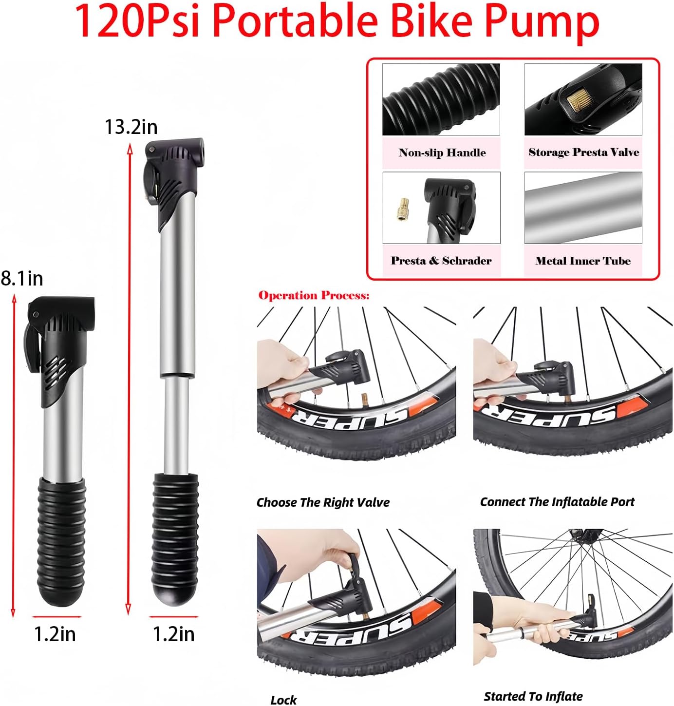 120Psi Portable Bike Pump:The mini Bike Pump is made of high-quality PVC and stainless steel, Built-in boost pressure system, the max 120PSI pressure pump allowing to pump up flat tires with less force. With the valve adapter under the lock lever, the inflator fit for both Schrader and Presta valve mouth.