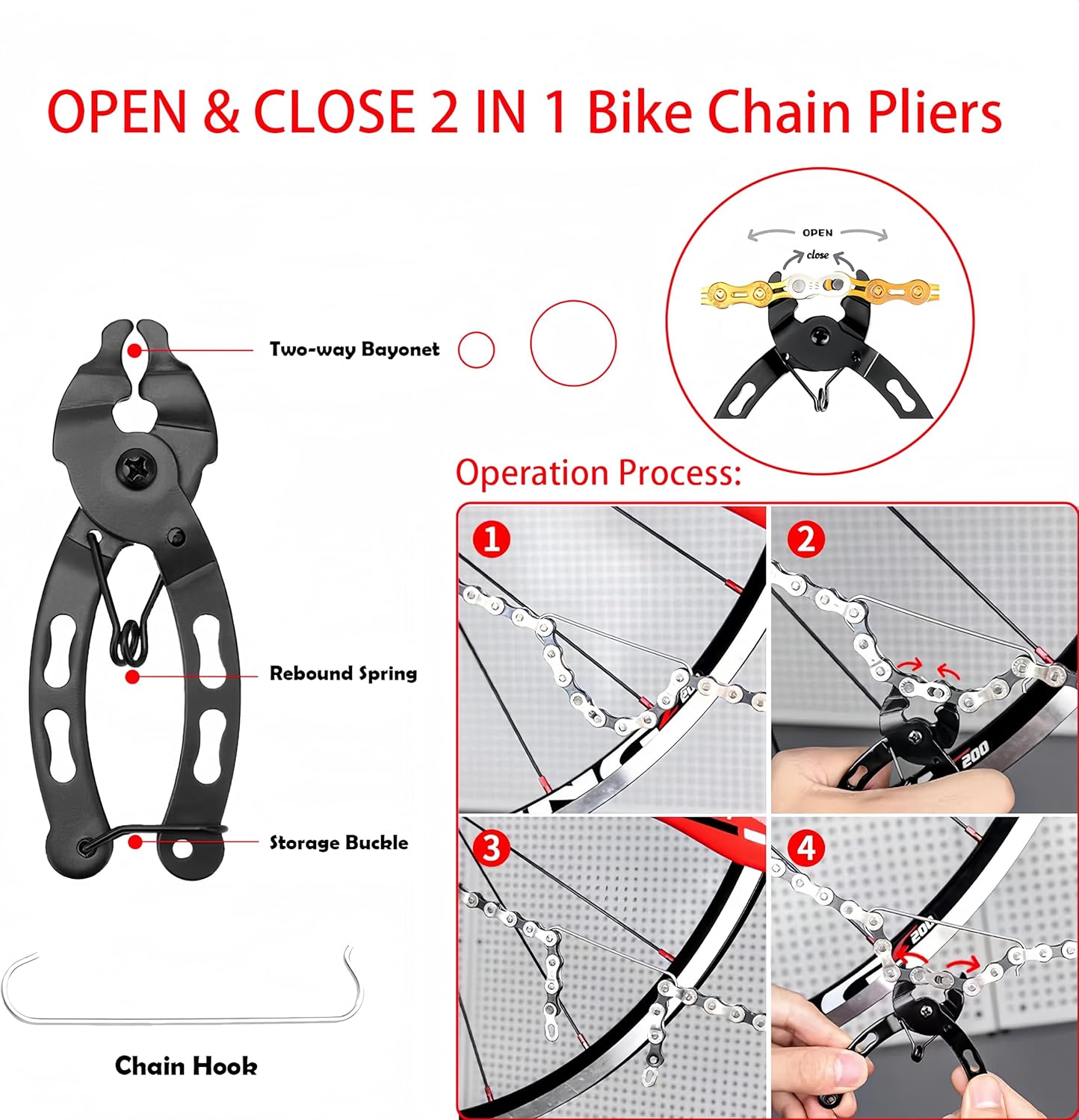 Bicycle Chain Tool Kit: OPEN & CLOSE 2 IN 1 bike chain pliers are designed to help remove and replace master links in modern chain systems. Over time, dirt and corrosion, it is impossible to separate the joining link by hand. with this Link Plier, easy to pull the chain link into its closed position or open the master link.