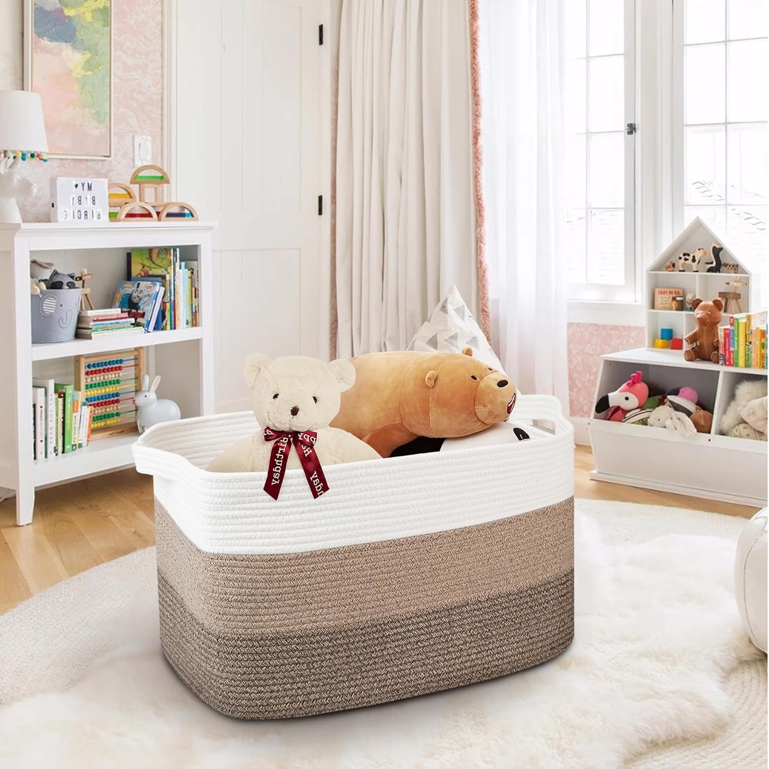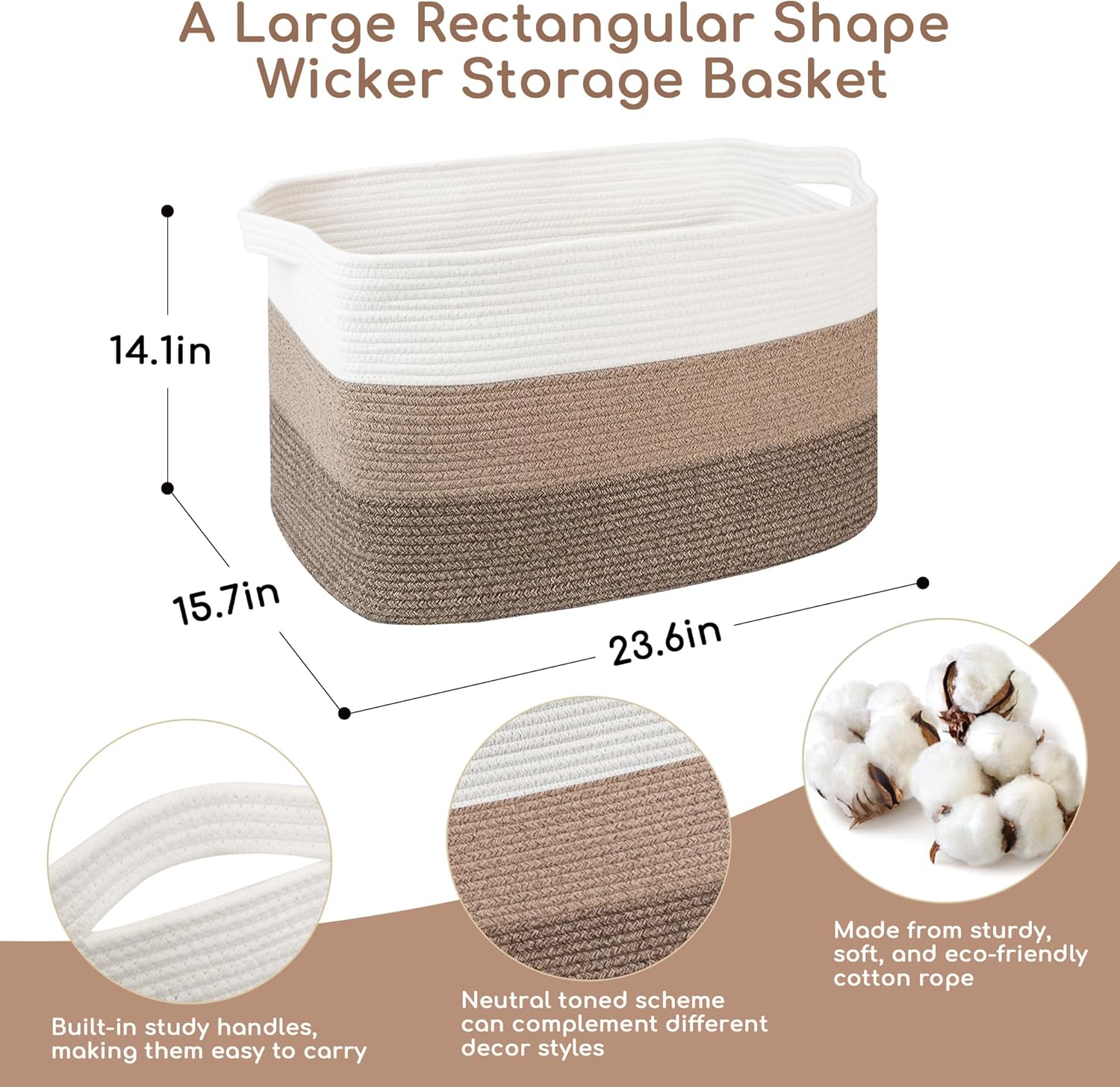 Unique rectangular shape basket, 3 toned brown XXXL large, Dimensions: 23.6”(L) x 15.7”(W) x 14.1”(H) Natural fabric cotton rope material, soft but firm construction, odor-free Easy-grip handles for easy carry Hand and machine washable