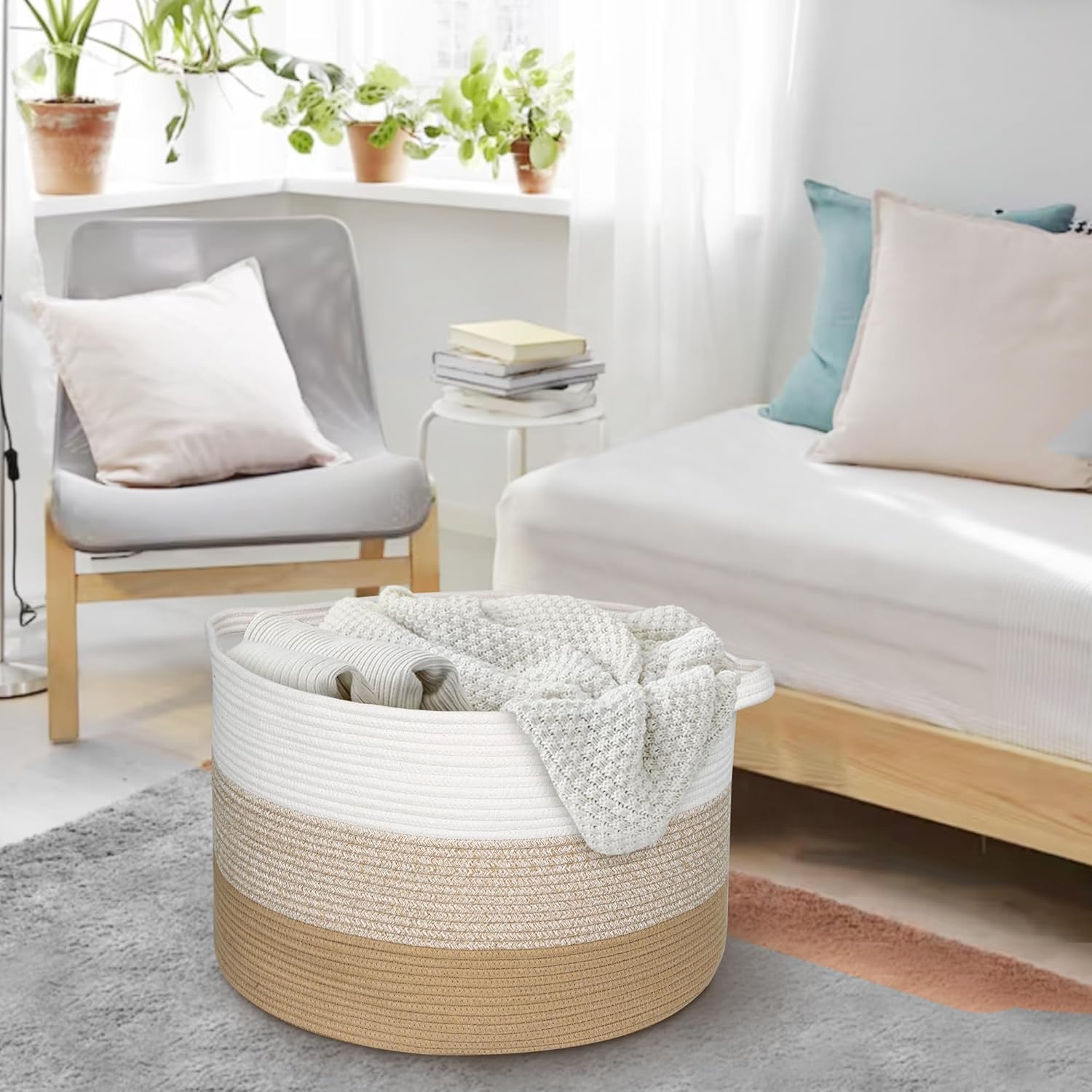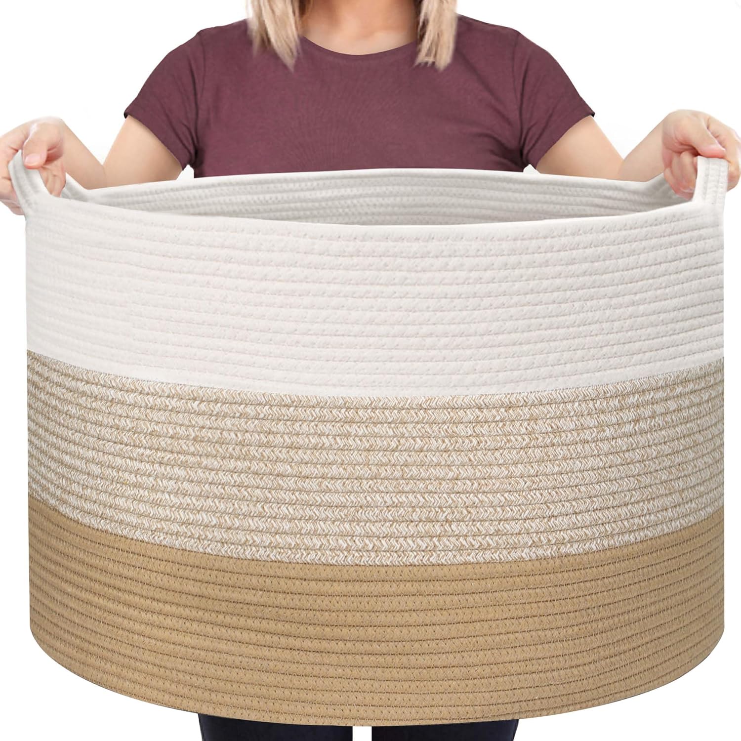 WOVEN COTTON ROPE BASKET: This XXXL basket is crafted from durable, thick cotton rope, designed to easily maintain its round shape. The breathable material allows for airflow, preventing moisture buildup and keeping blankets fresh and odor-free. Free of chemical smells, it is safe, soft, and gentle for babies, kids, and dogs. Plus, it won’t scratch floors or walls, making it a perfect addition to any home.