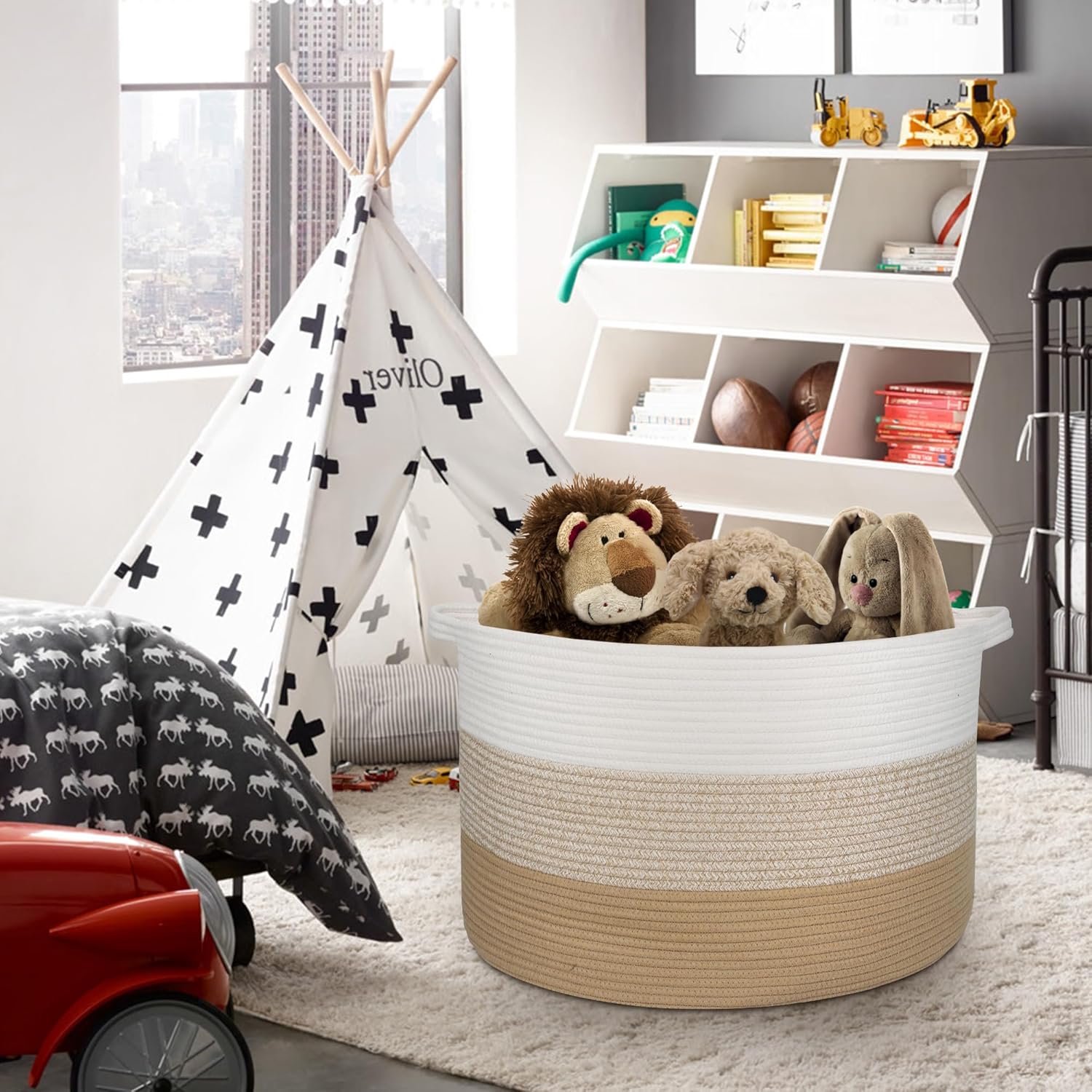 VERSATILE STORAGE BASKET: This large basket is highly versatile and perfect for storing a variety of items. It can be used in multiple spaces for different purposes—storing kids’ toys and clothes in the playroom or bedroom, holding dirty laundry in the laundry room, organizing towels or toiletries in the bathroom, or keeping pillows neatly stored in the bedroom.