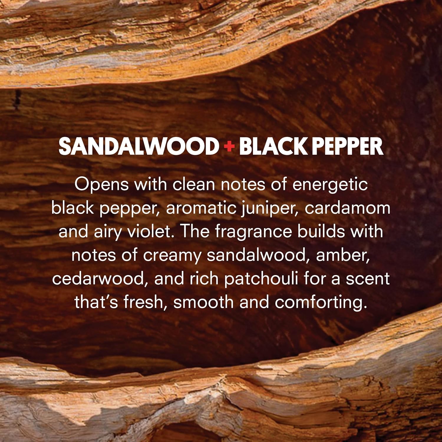 SANDALWOOD + BLACK PEPPER: This warm and woody scent features Cardamom, violet, Elemi oil, and rose that create a rich yet light fragrance. Sandalwood, cedarwood, amber, and patchouli give it a fresh, smooth, and comforting character.