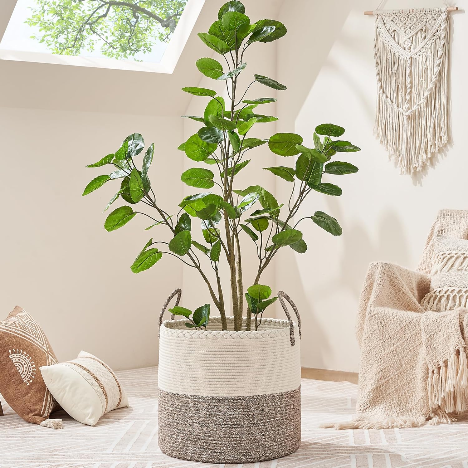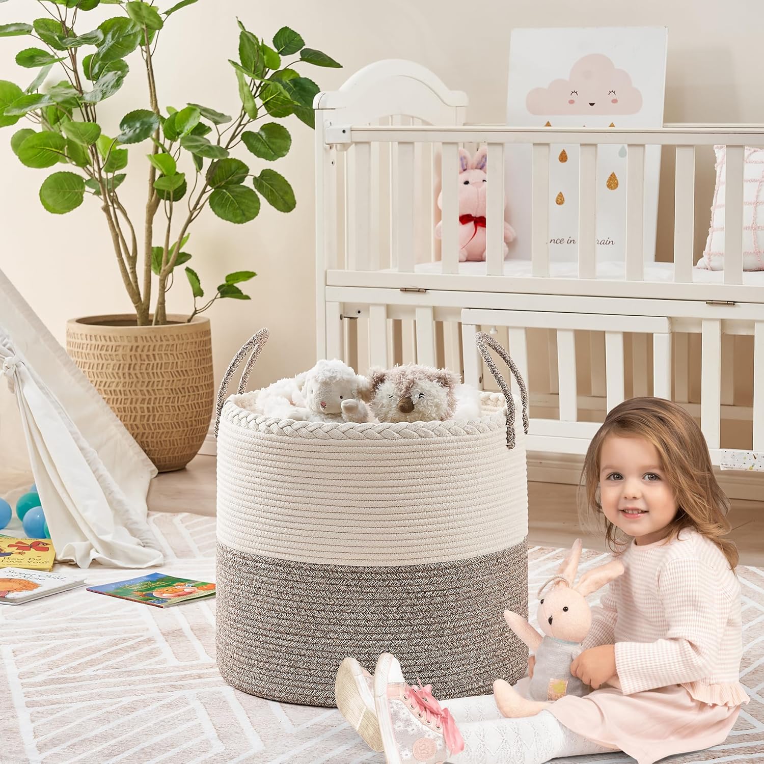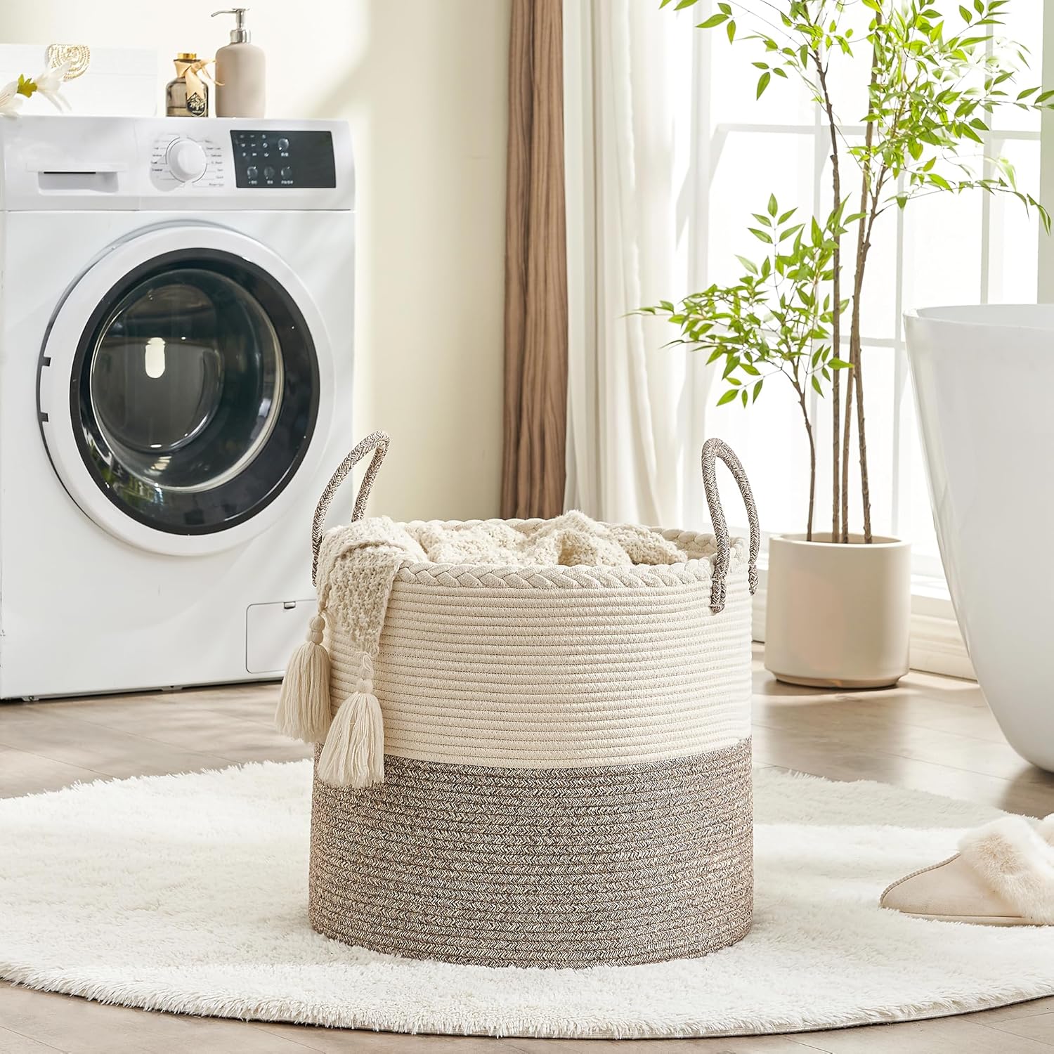 ⭐【100% NATURAL HANDMADE】:100% cotton rope,soft material without any chemicals woven basket. There are No plastics. No harsh chemicals. Our basket is soft and safe for kids and pets.our rope baskets are super durable and hold their shape well. they can be hand washed / air dried or put in your washer / dryer on delicate.