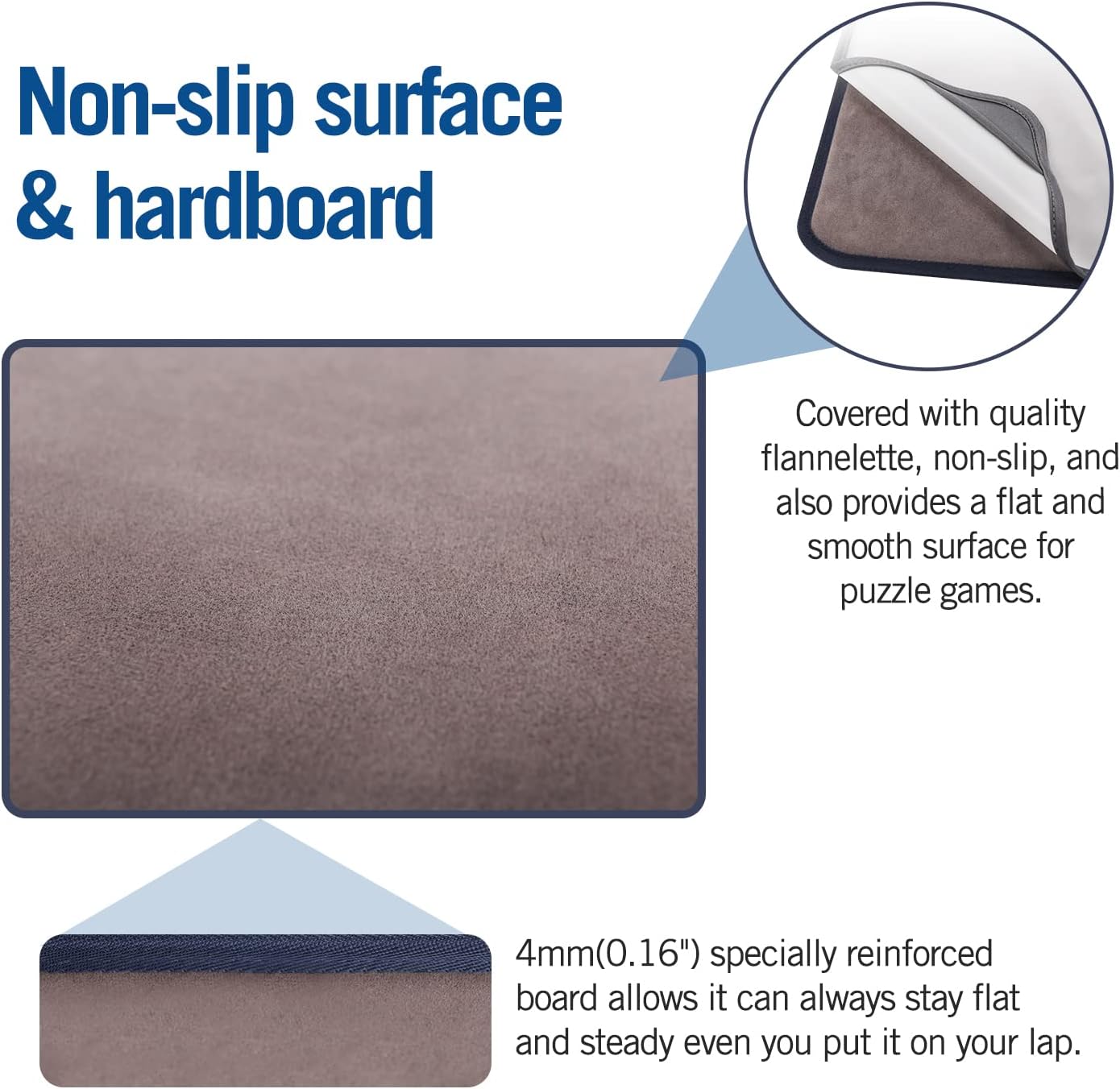 Non-slip surface & hardboard – 4mm(0.16″) specially reinforced board allows it can always stay flat and steady even you put it on your lap. Covered with quality flannelette, non-slip, and also provides a flat and smooth surface for puzzle games.