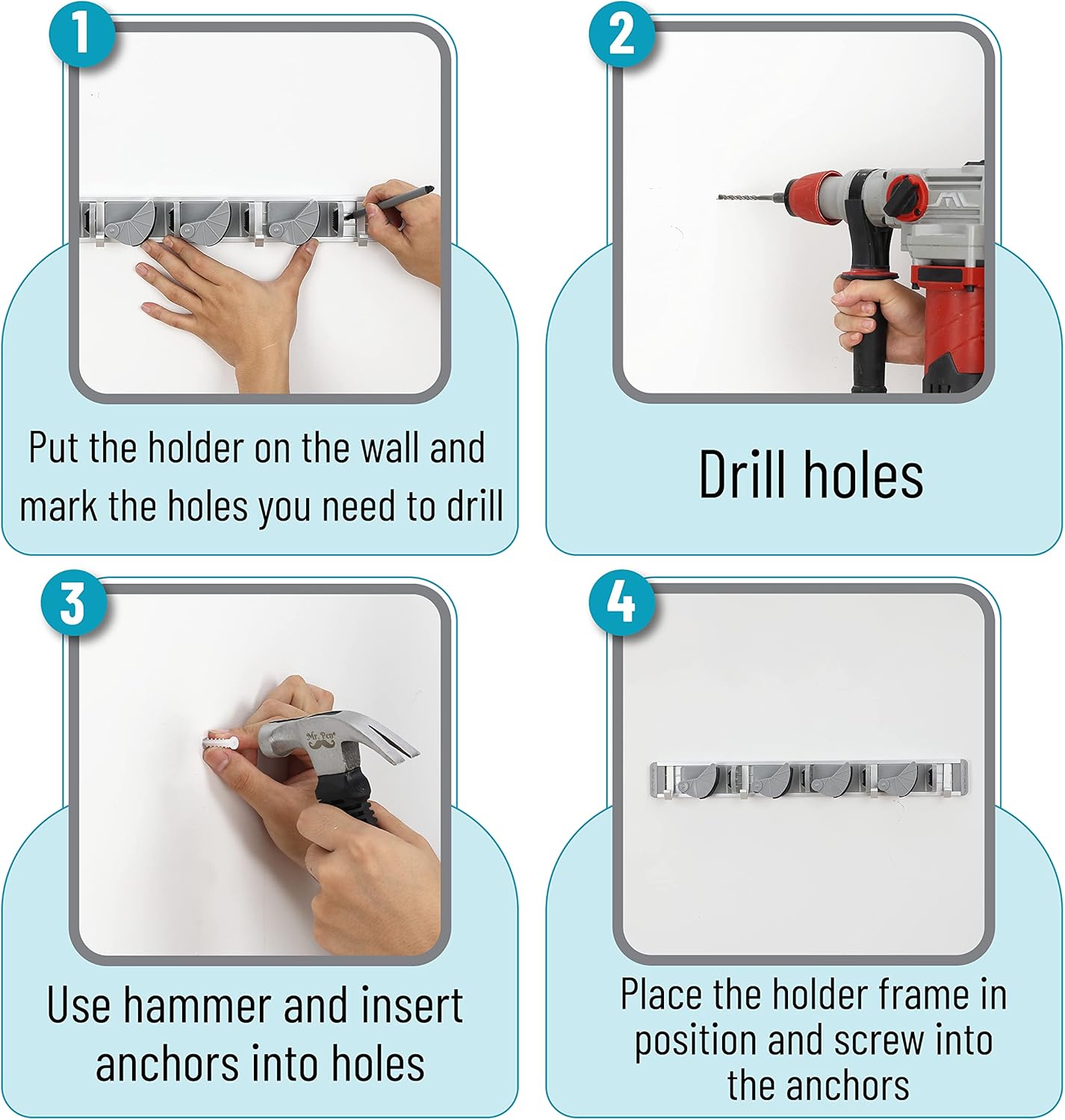 Mr. Pen mop and broom holder is made of high-quality aluminum and ABS materials. This high-quality material is lightweight, extremely durable, and guarantees a long service life.