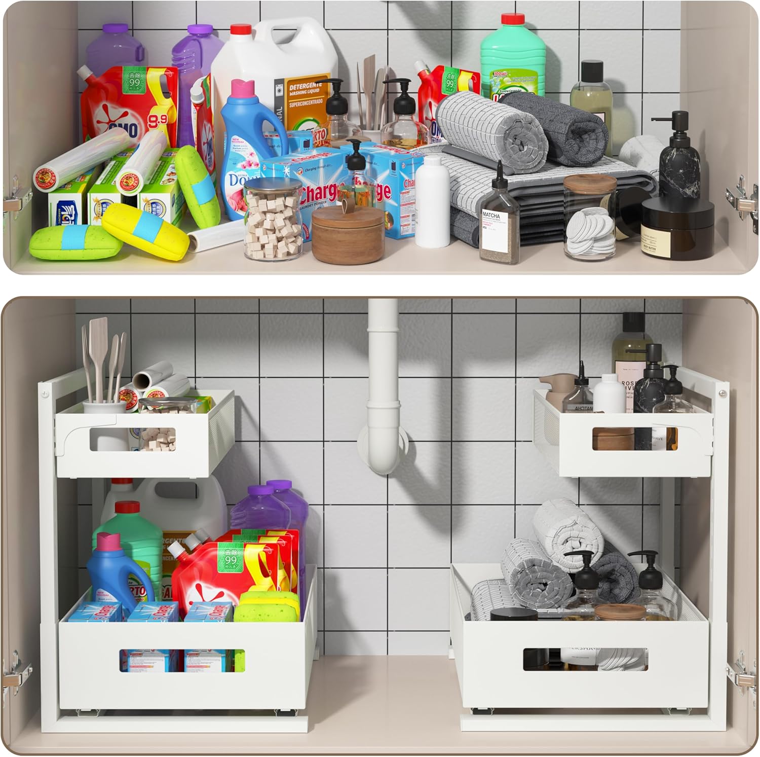Updated L Shape Design: 7 heights adjustment L-shaped design with 2-Tier basket Organizers, maximizing the vertical space of the sink based on plumbing and garbage disposal condition, no matter bottles or any other kithchen tools could be organized in both 2 tiers which can solve user cabinet storage troubles.