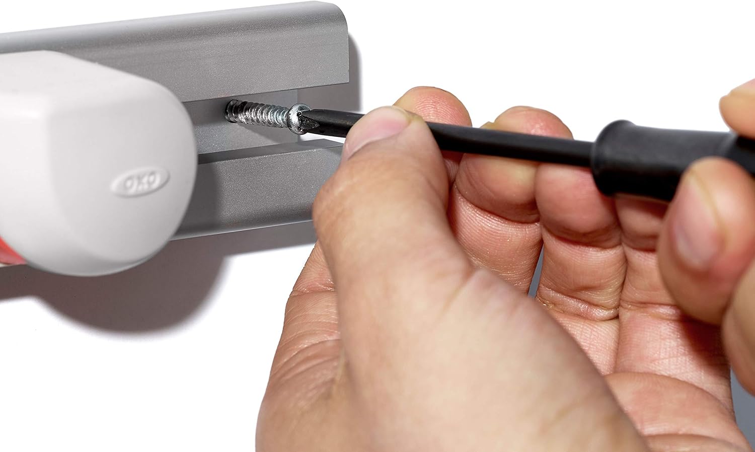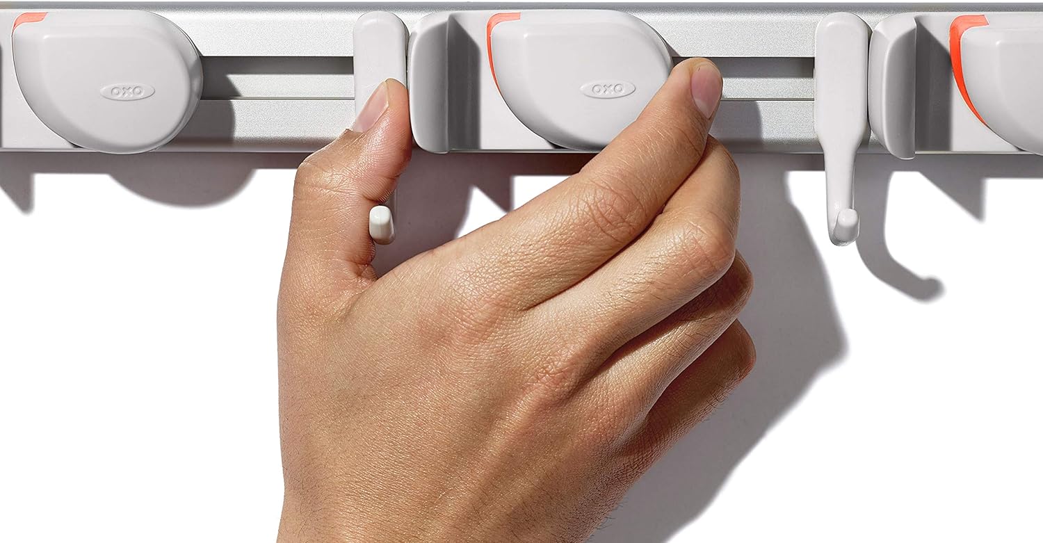 The OXO Good Grips Expandable On-the-Wall Organizer is an easy way to customize storage in your closet, hallway, mudroom or garage. Our easy-to-mount Organizer includes simple instructions plus screws, drywall anchors and a leveler for fuss-free installation. The adjustable design expands from 15 in/38 cm to 24 in/61 cm, and the customizable grip locks and hooks can be arranged to accommodate even hard-to-store items. A simple one-handed press firmly stows long-handled tools like brooms and dusters in the non-slip grip locks. The convenient hanging hooks are a handy spot for dog leashes, sports equipment and backpacks.