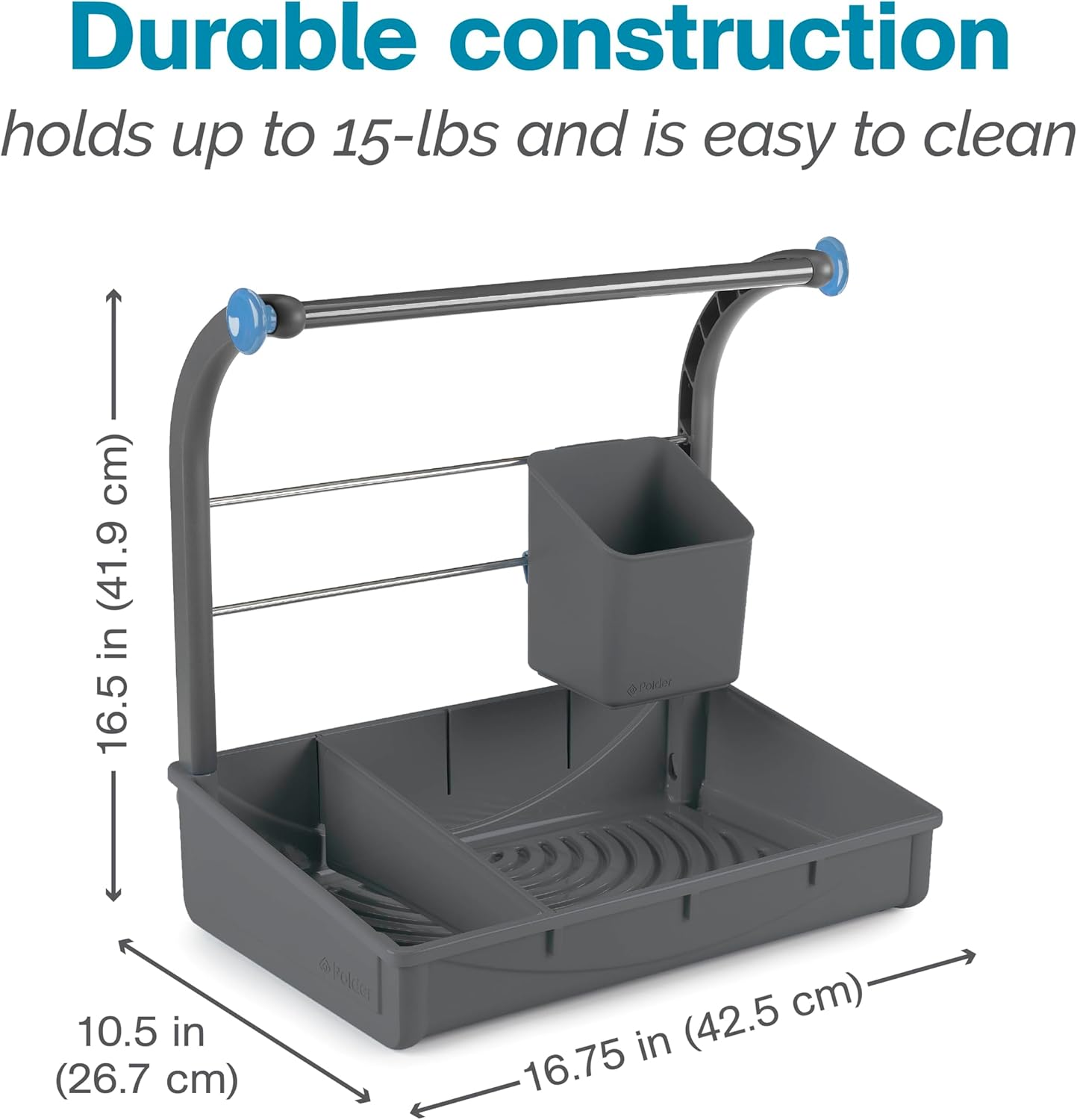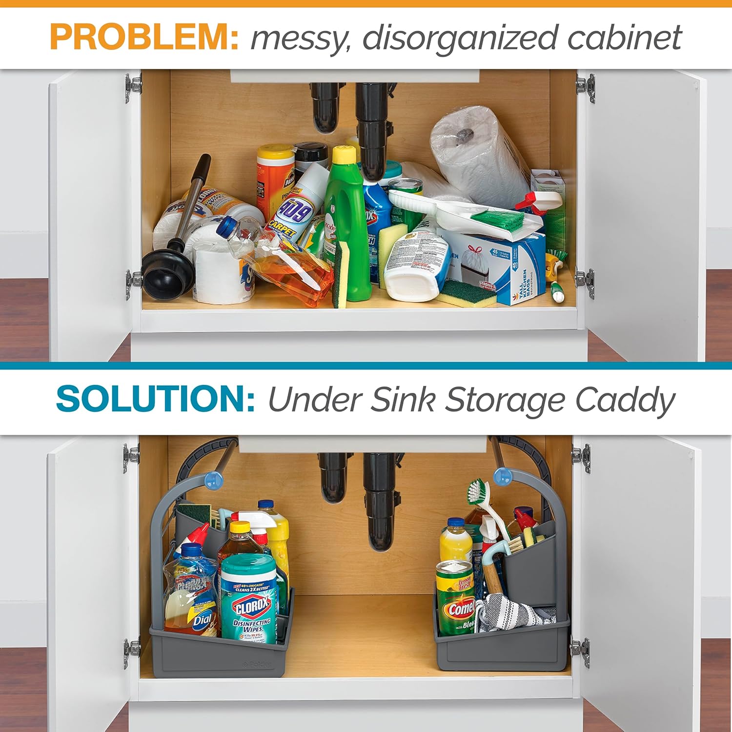 Easy to Assemble: The adjustable divider insert of the organizer can be placed in three locations for secure and customized storage. The Polder Under Sink Storage Caddy requires minimal assembly, measuring 16.75″ x 10.5″ x 16.5″, when fully set up.