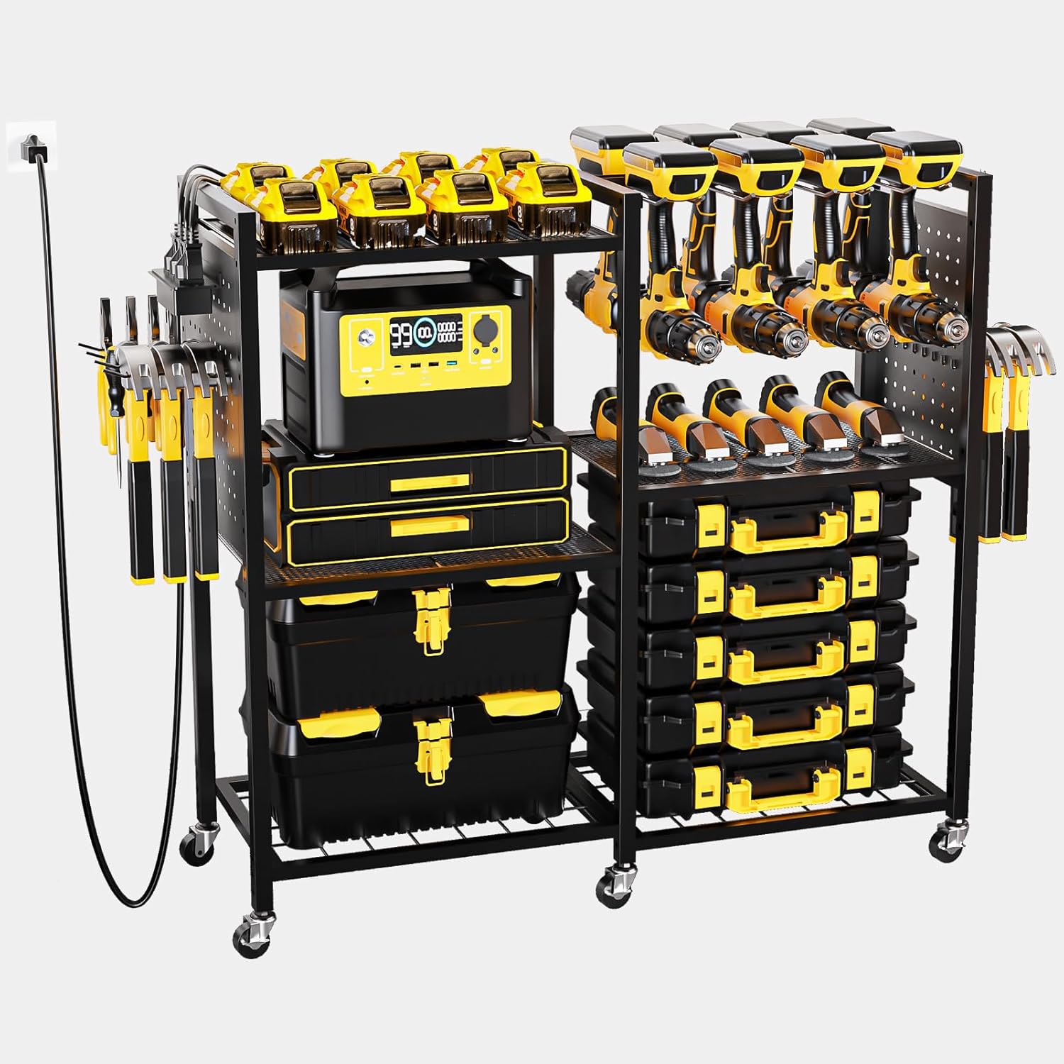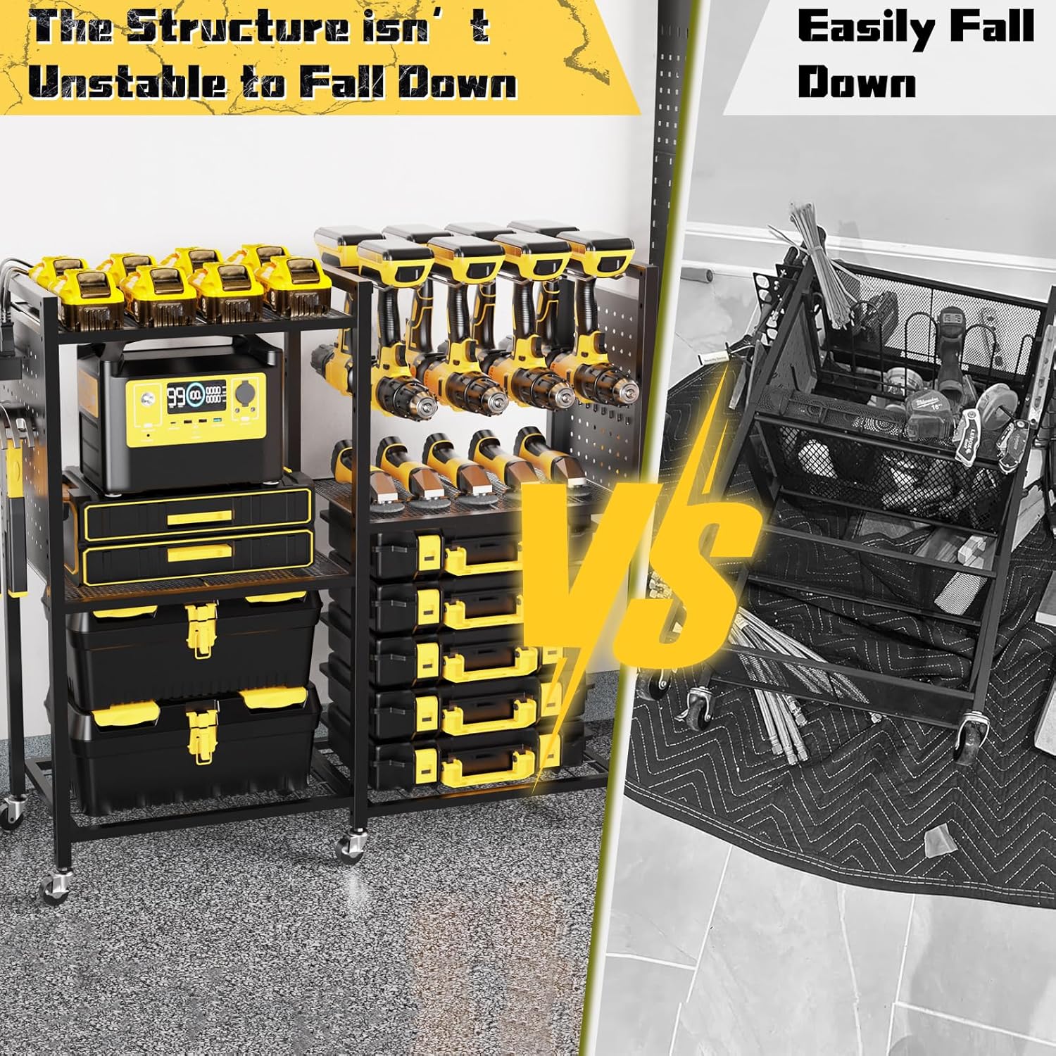 【UPDATED POWER TOOLS ORGANIZER CART】 Upgrade your storage with our wider, taller design (16.5’’ x 12.4’’ x 7.3’’) offering 2-3 times more space than standard options. Featuring 6 load-bearing wheels for easy indoor and outdoor movement, this Tools Battery Storage Cart is perfect for DIYers and pros wanting organized, accessible tools without wall damage worries.