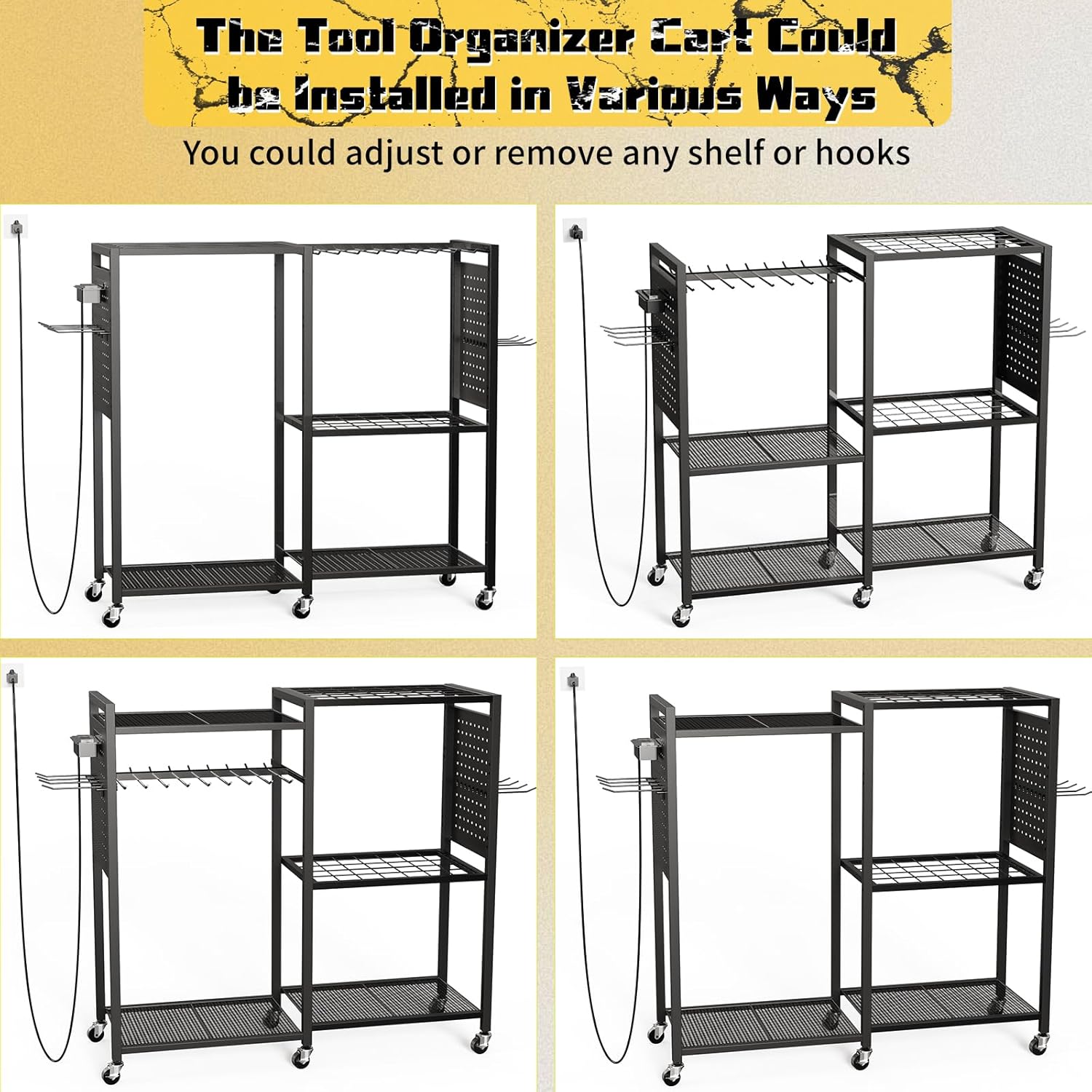 【FLEXIBLE ASSEMBLY】Customize your storage space with 10 positioning holes in each metal frame. Move each tool storage shelf or drill holder shelf up and down or remove on demand, using rolling tool cart as a power tool organizer, garden tool organizer, or shed organizer