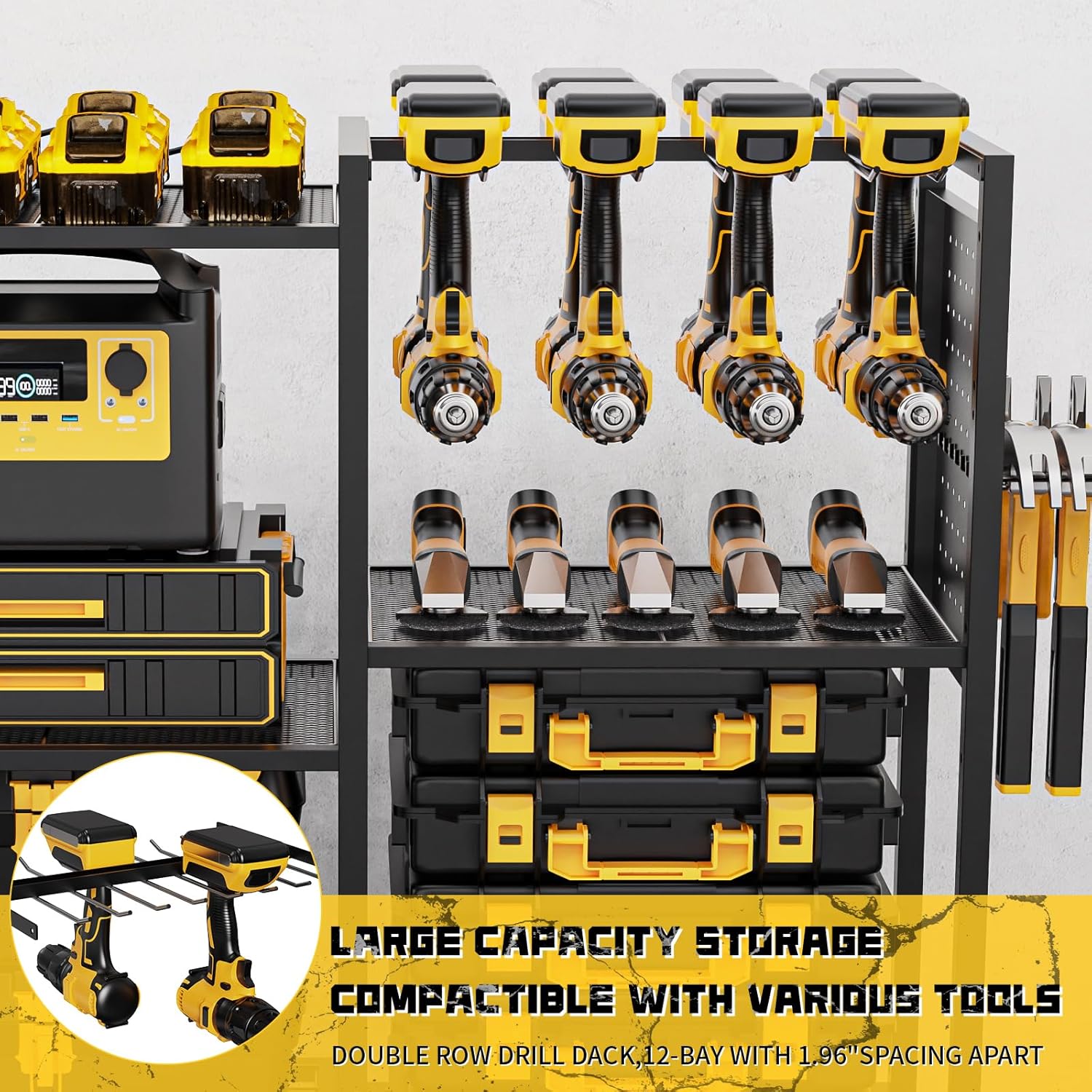 【MAXIMIZE YOUR STORAGE SPACE】Organize all your garage or garden tools efficiently with our 6-tier power tool organizer that features 14 fixed hooks and 4 removable hooks on the side panels. With a large capacity, it can easily hold up to 8 drills or be used for direct hooks for smaller tools. Plus, it frees up precious storage space and keeps everything in easy reach