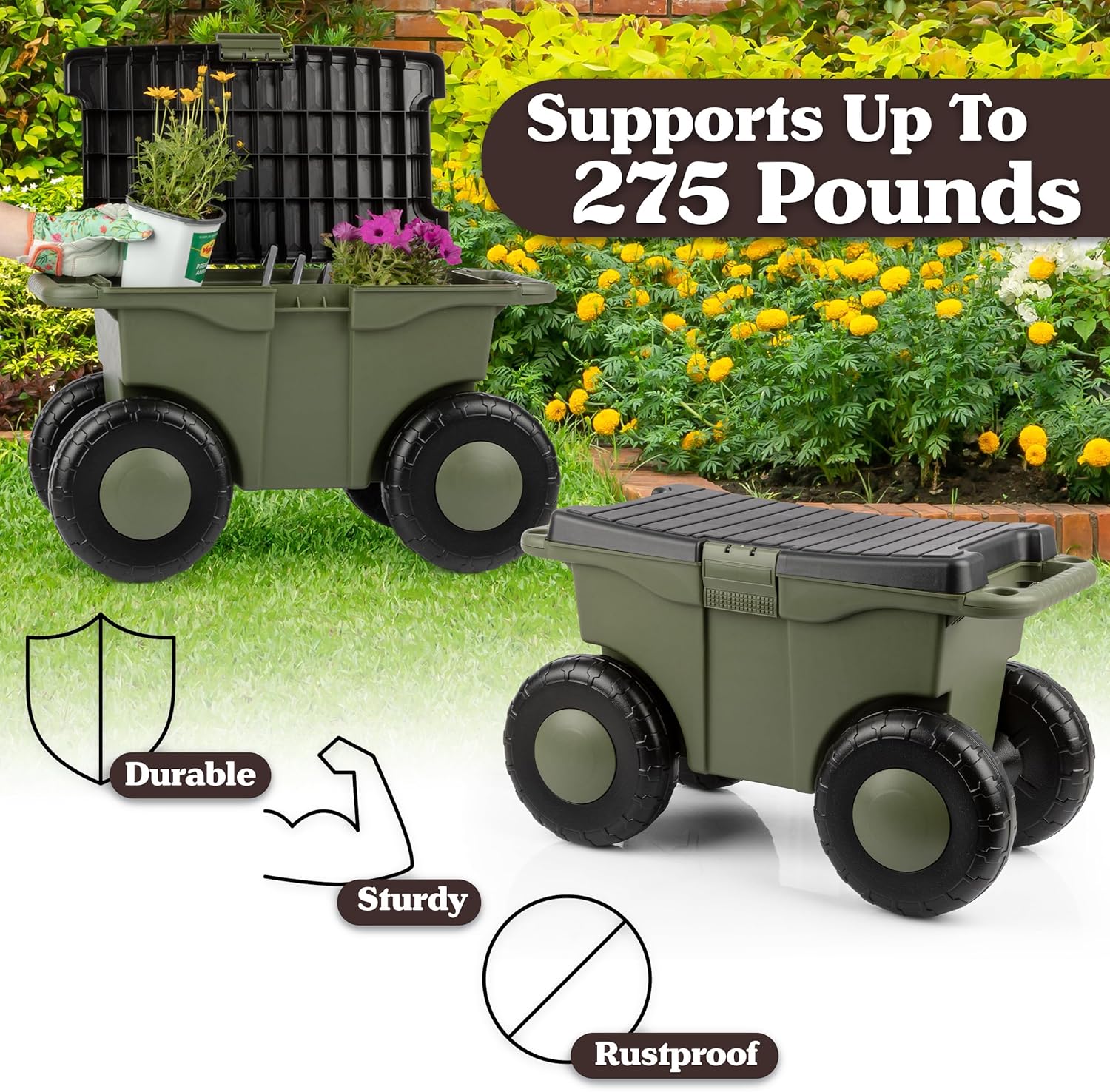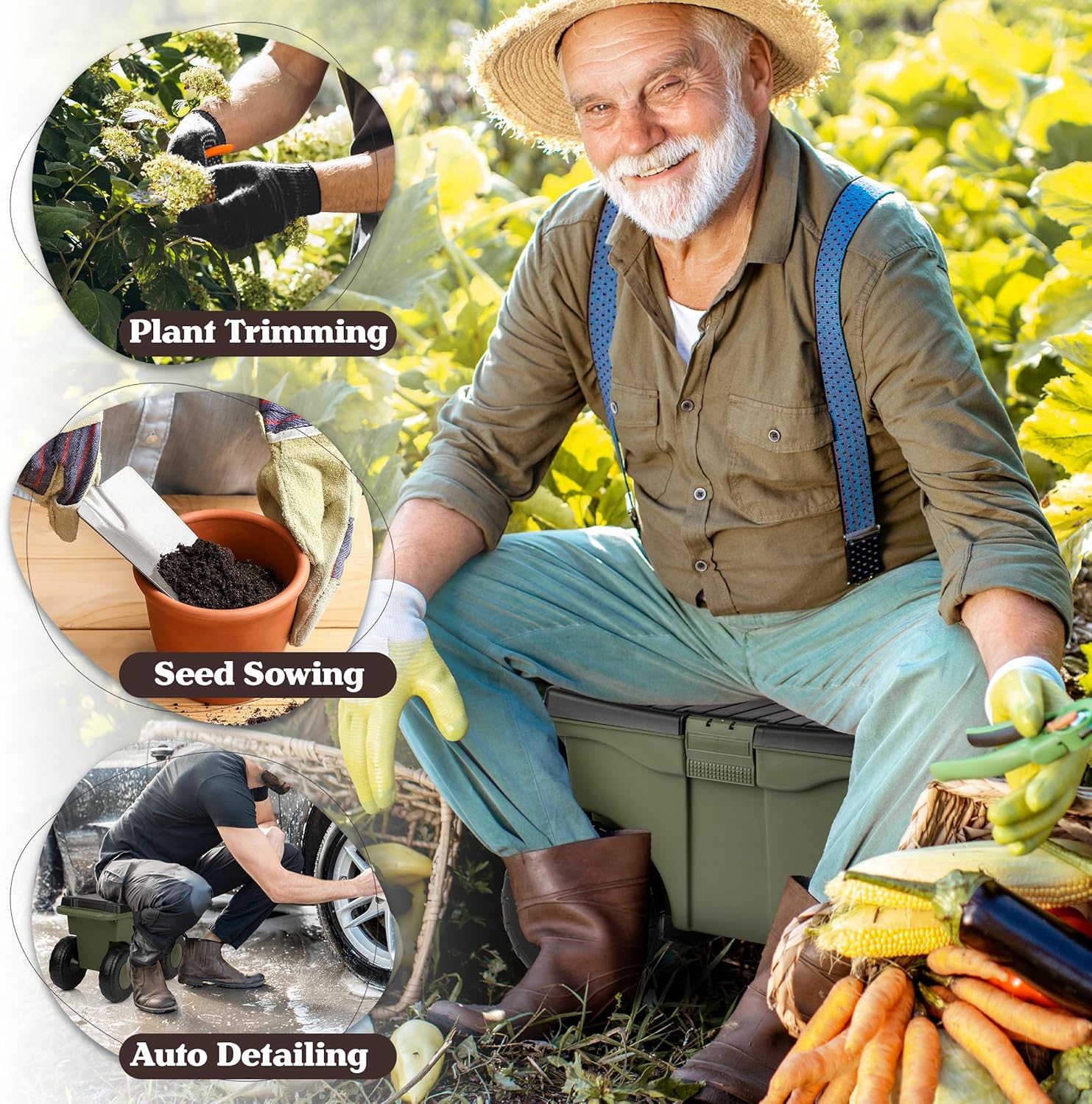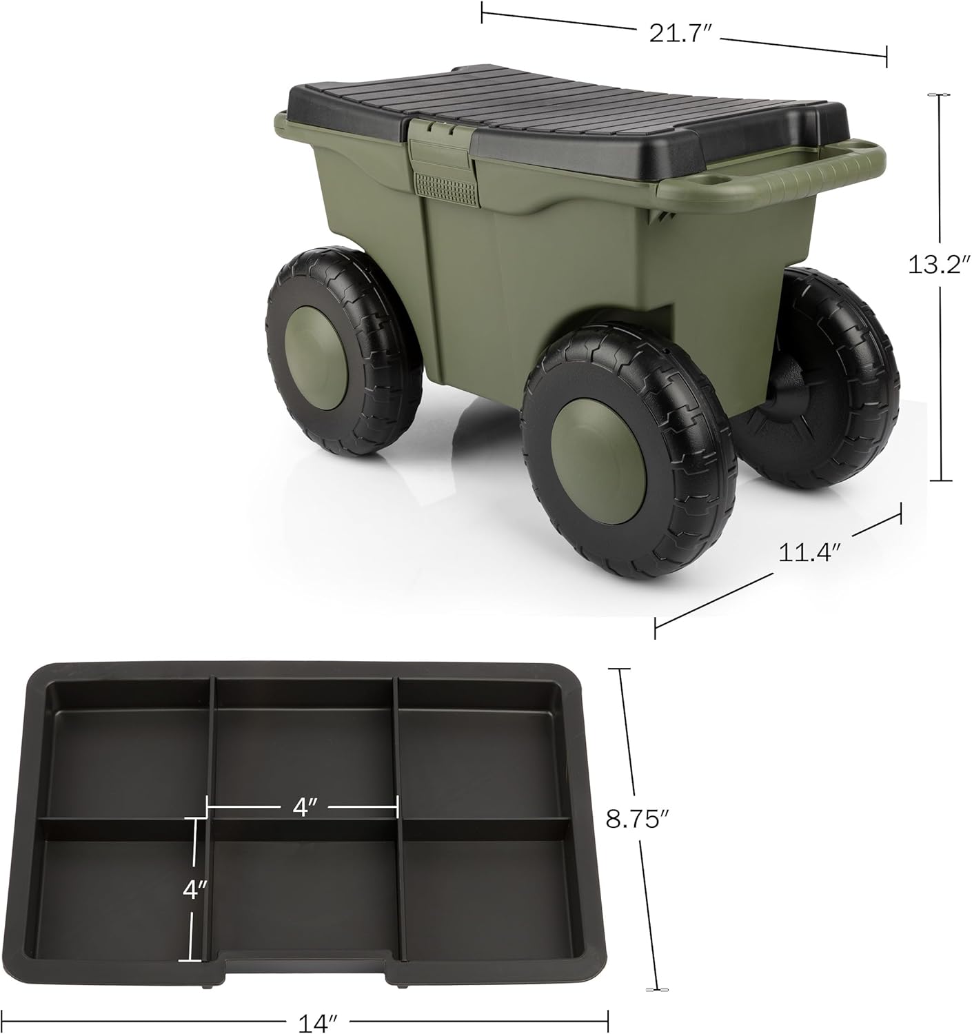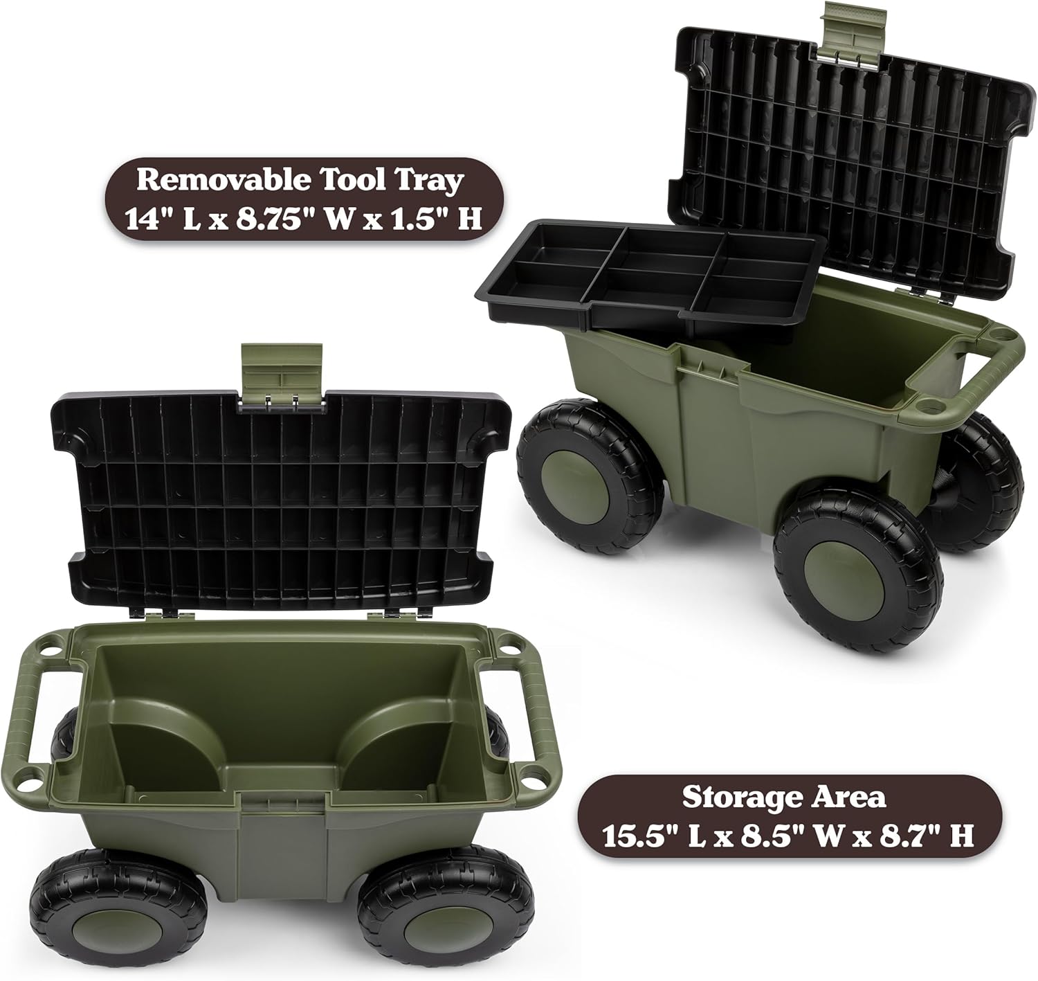 SPACIOUS STORAGE – The spacious interior and removable tool tray in this garden scooter are perfect for keeping all your tools and supplies in one convenient place, allowing easy storage of gloves, planting shovels, gardening shears, and more.