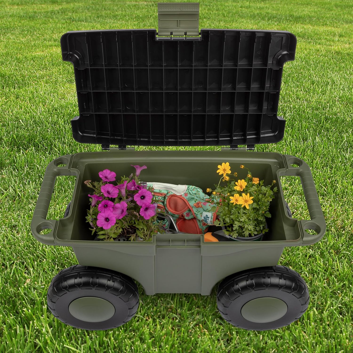 ROLLING GARDEN CART WITH SEAT – This garden stool is ideal for anyone eager to ease back and knee pain when planting and weeding, as its lid offers a sturdy seat that makes low-to-the-ground tasks much easier, with less need for crouching and stooping.