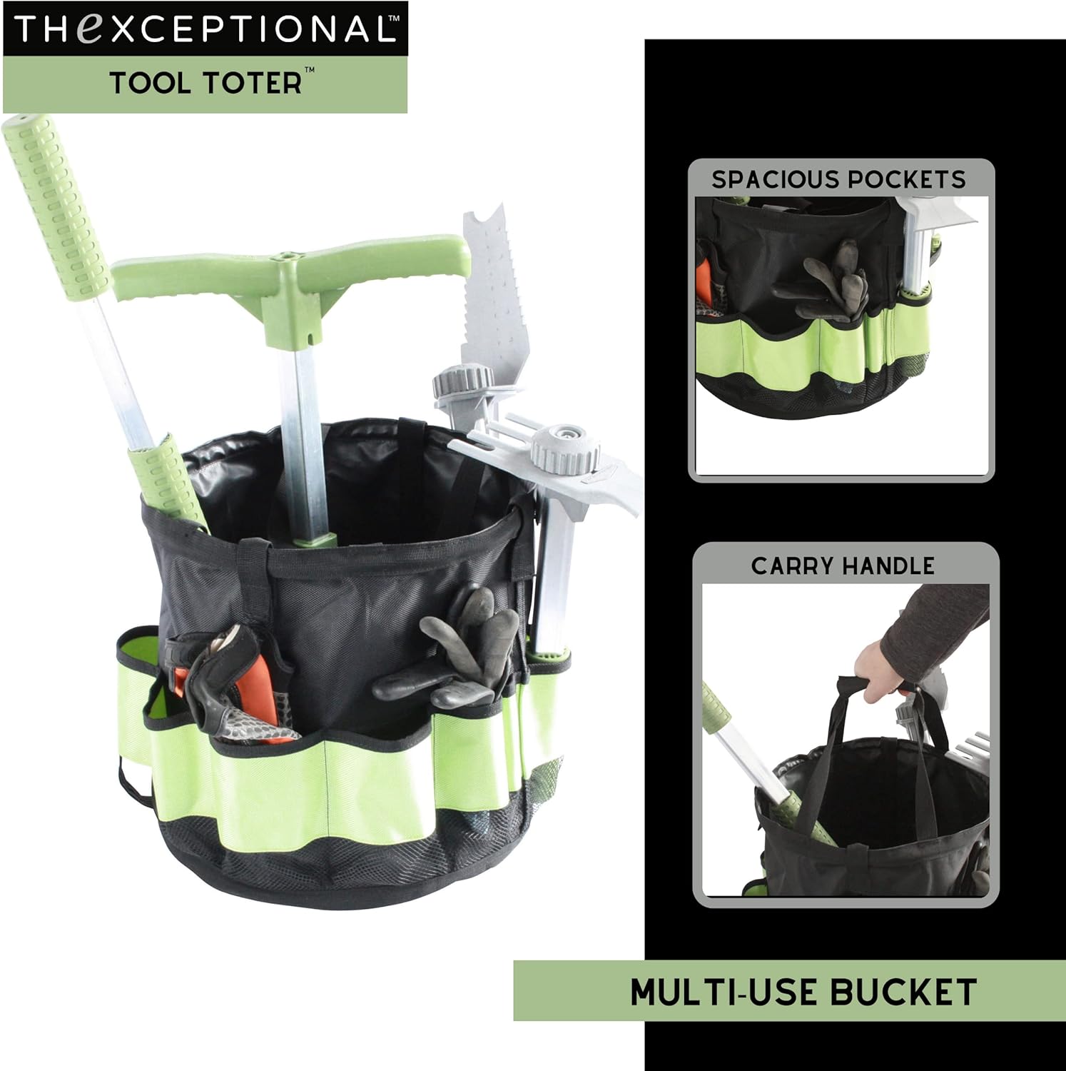TOOL TOTER BUCKET helps harvesting while holding small hand tools and supplies, the tool toter harvest bucket with pockets is fully transportable and functions similarly to a bucket tool organizer, easy install fiberglass poles keep the bucket rigid and upright making it in a ideal garden tool carry bag tote, this bucket organizer is light weight and durable for gardeners tools while harvesting vegetables and other garden plants, attaches easily with the included hanger for the tool toter bucket