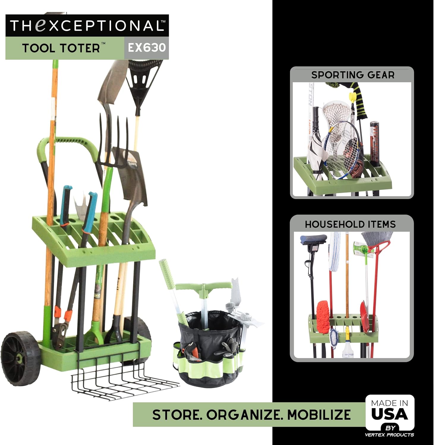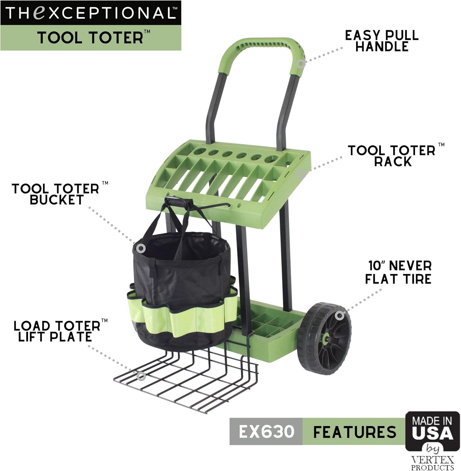 Rolling Tool Toter Cart & Bucket with Load Toter Lift Plate | Gardeners Tool Box On Wheels | Store, Organize & Mobilize Rake, Shovel, Hoe | Made in USA by Vertex Products | Model EX630