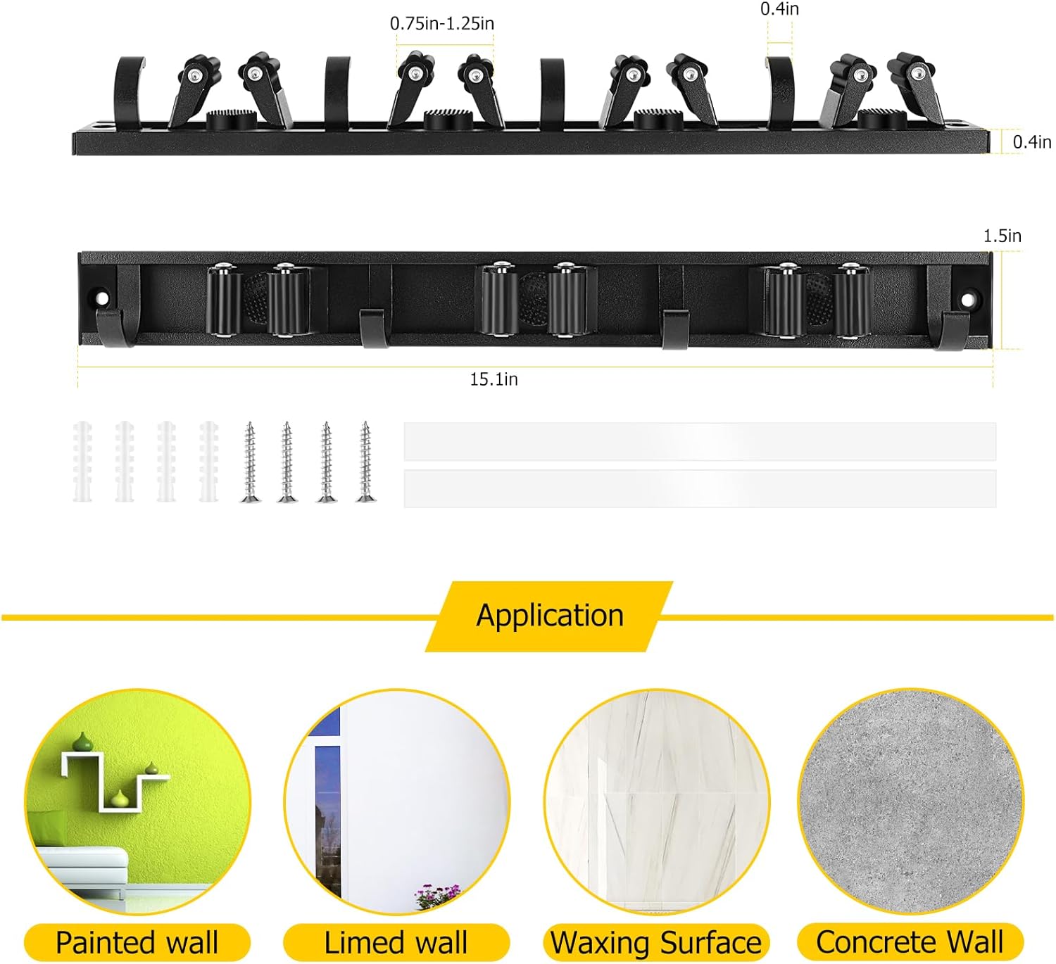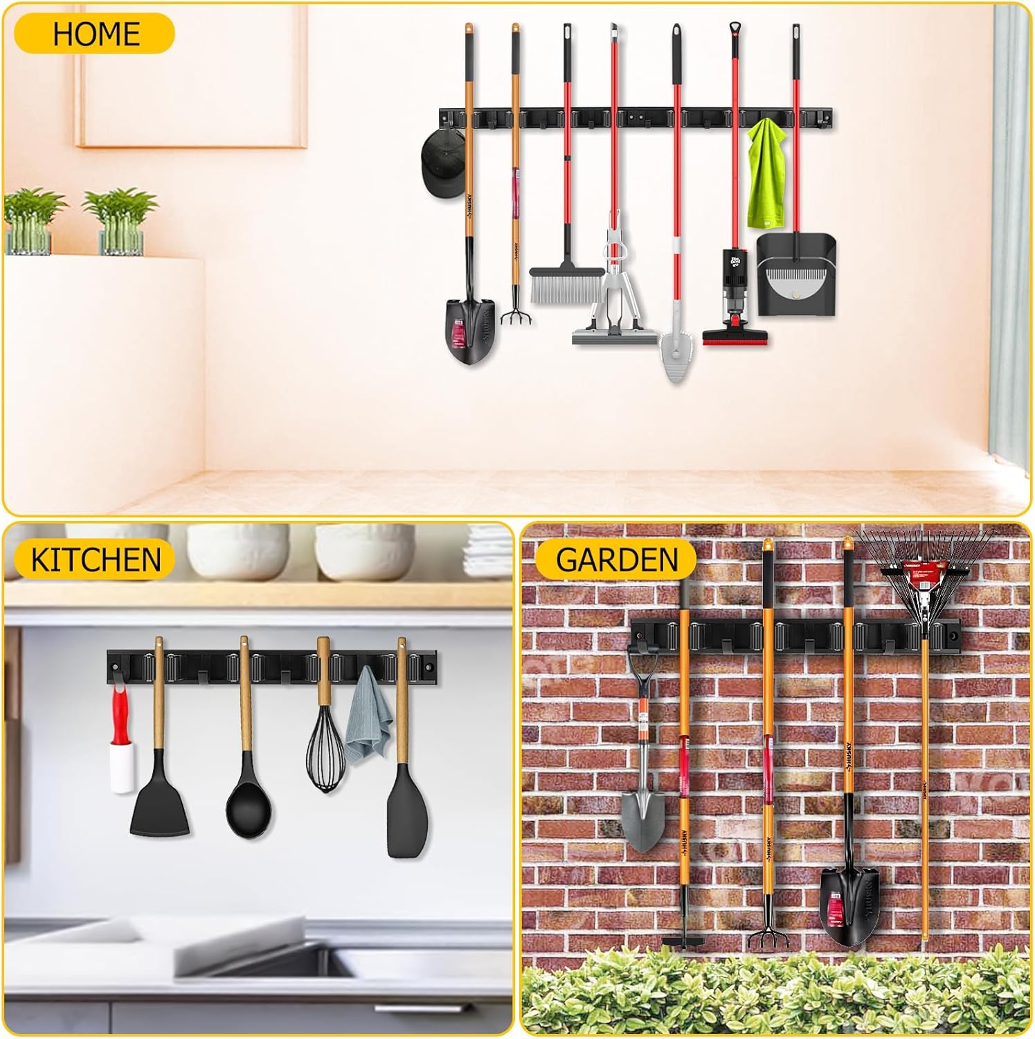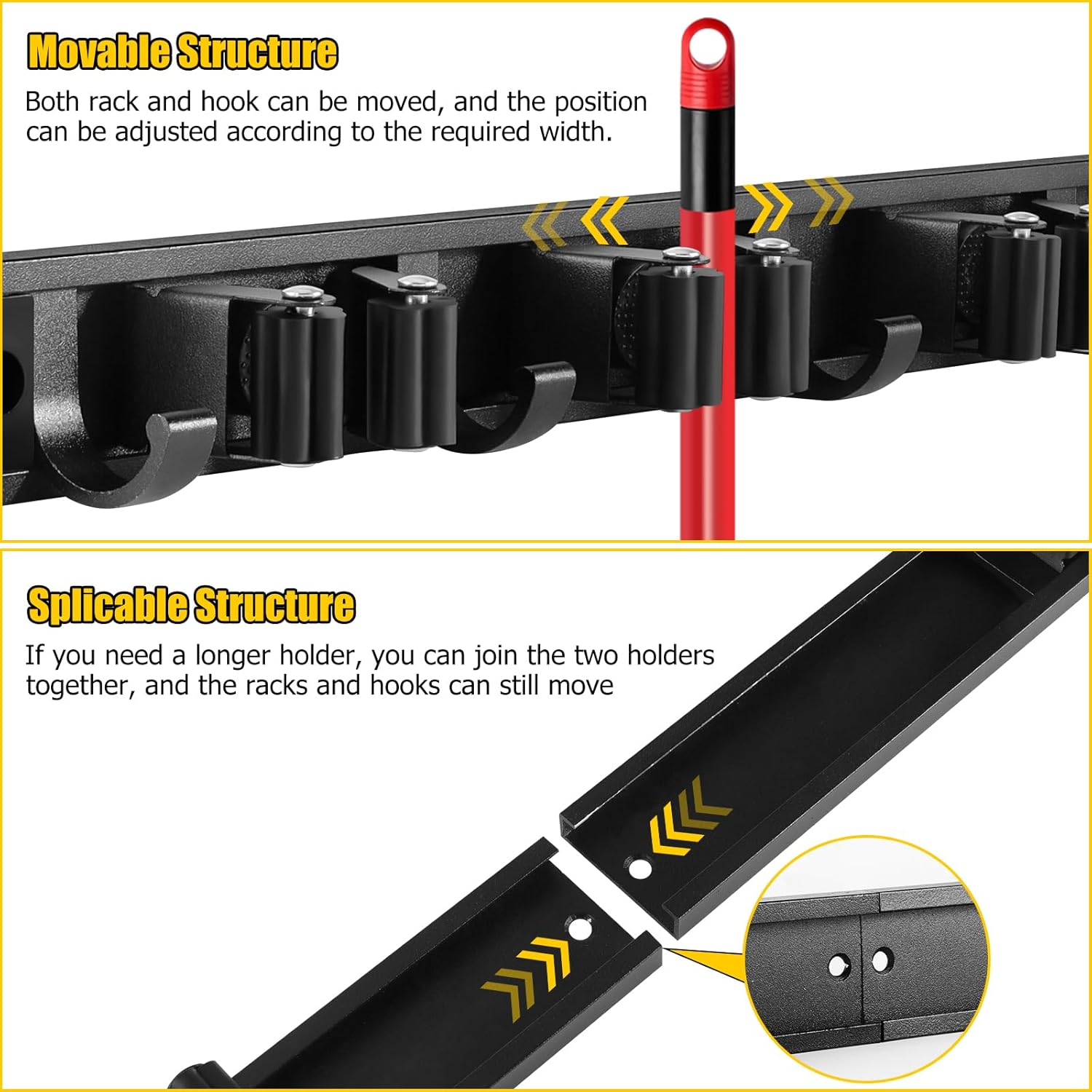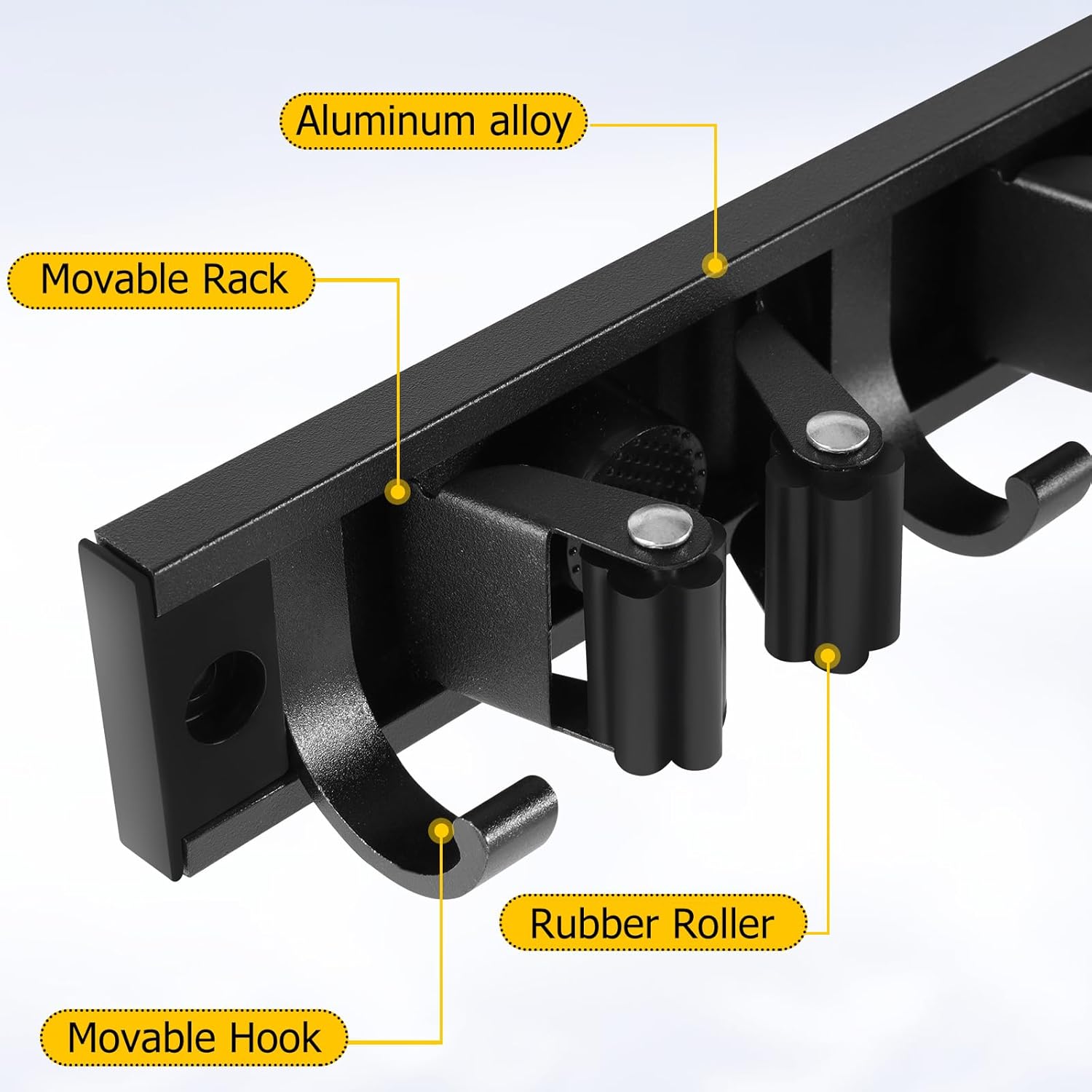 MOVABLE HOOK AND RACK: The hooks and racks of the broom organizer wall mount can slide on the black track, and you can customize their spacing according to your needs to maximize the use of space. The plastic stoppers at both ends of the track can be disassembled, and the arrangement order of the hooks and racks can be adjusted after disassembly.