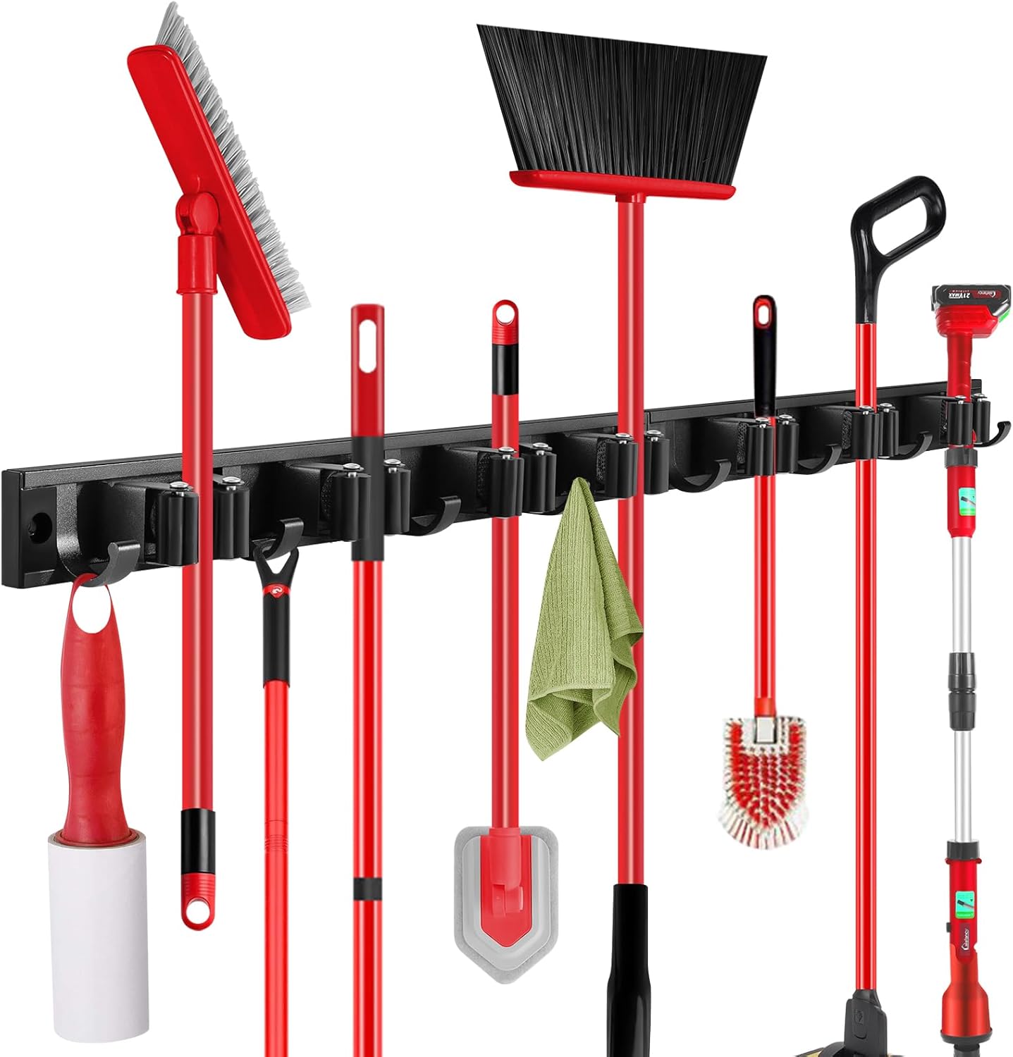 The hooks and racks of the broom organizer wall mount can slide on the black track, and you can customize their spacing according to your needs to maximize the use of space.