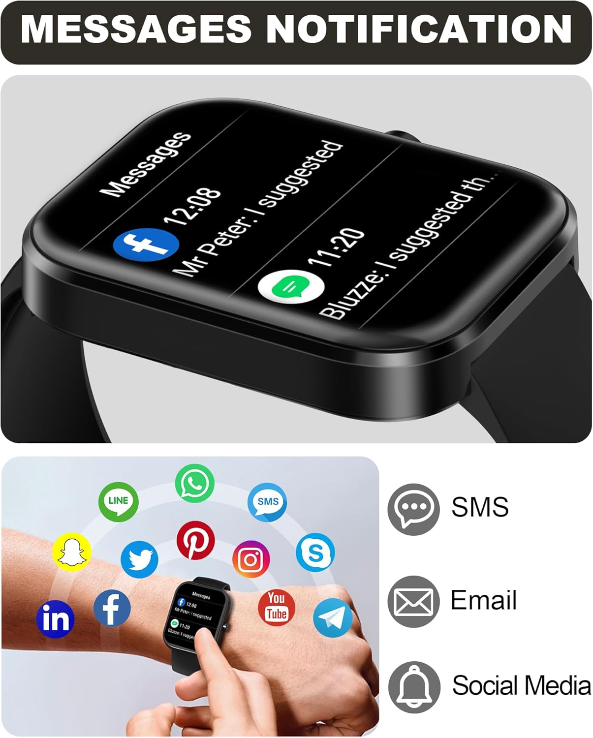Bluetooth Calls & Message Notification: Bambooinn Smart watch is compatible with Android and iOS phones. Once the smartwatch connects to the app “GloryFit,” you can make phone calls and play music. You can also receive message notifications on your smart watch from social apps such as Facebook, SMS, Instagram, Twitter, WhatsApp, etc.