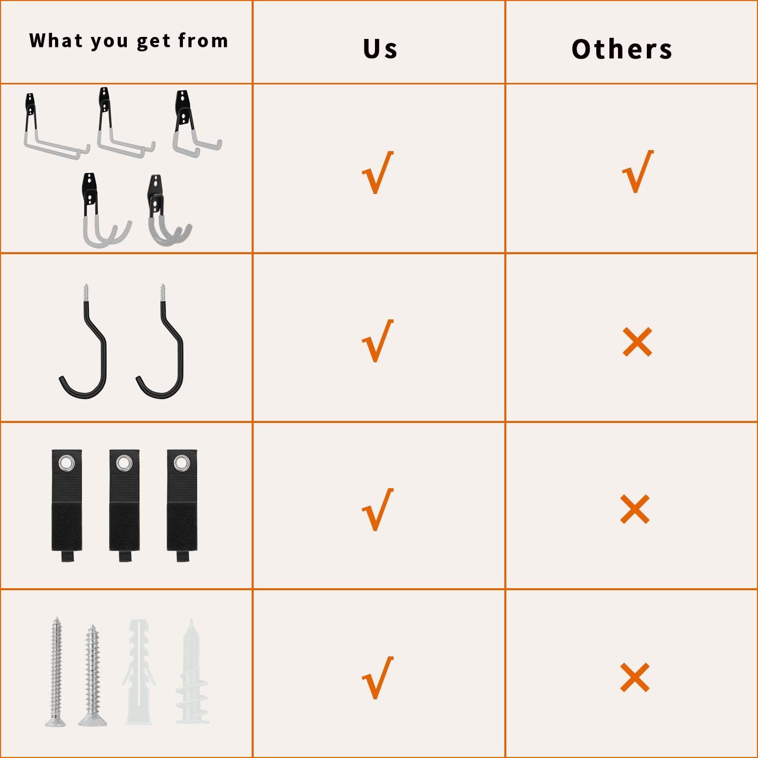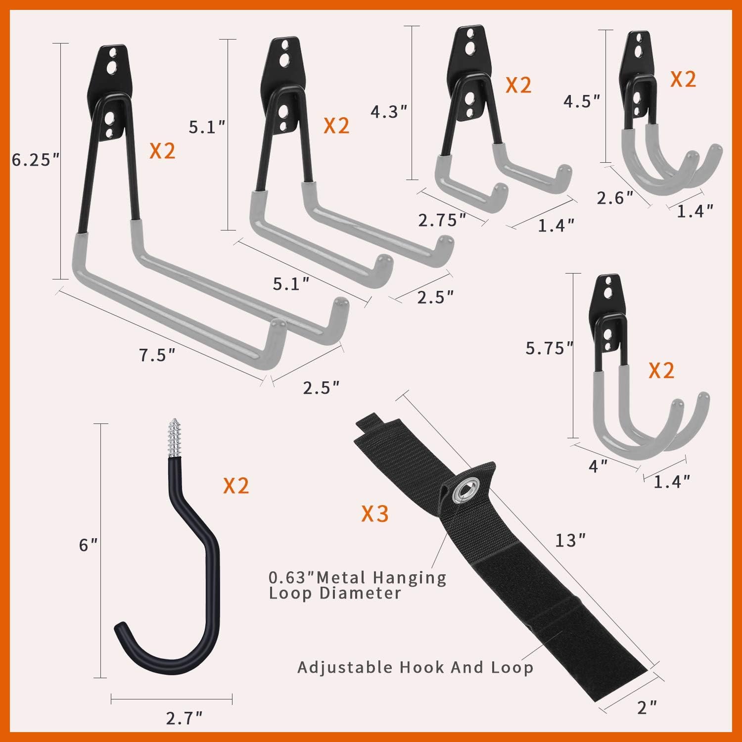 【Versatility】This pack of 15 hook set will cover all of your storage needs. Multipurpose in one set of storage hangers. The length of the flattened double bar hook makes it ideal for ladders, foldable chairs, brooms, lawn garden tools, mower, sports gear, seasonal items or hockey sticks. The perfect solution for your favorite toys like surfboards, kayaks, and anything bulky that needs to be well taken care of.