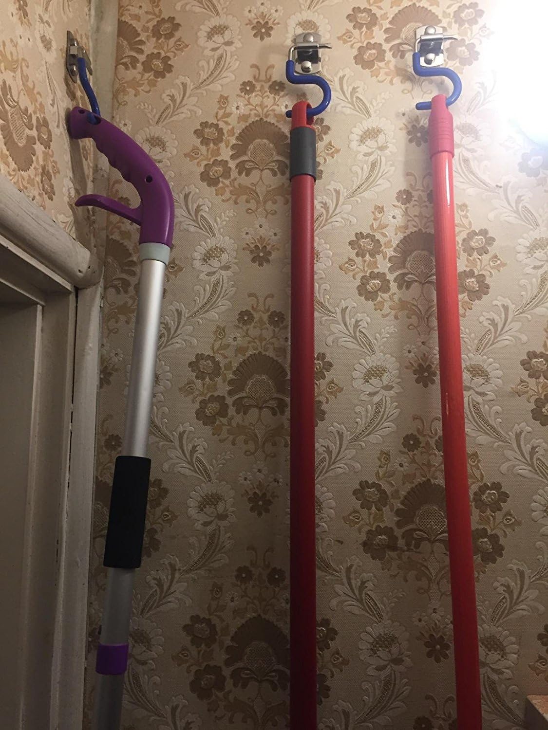 Easy to install, looks awesome, and the hooks that holds your heavy brooms. Nicely to a variety of handle sizes but holds firm. The hooks are fairly sturdy and fold out of the way when not being used. You can hang a broom, swifter mop and swifter duster and other long-handled tools.