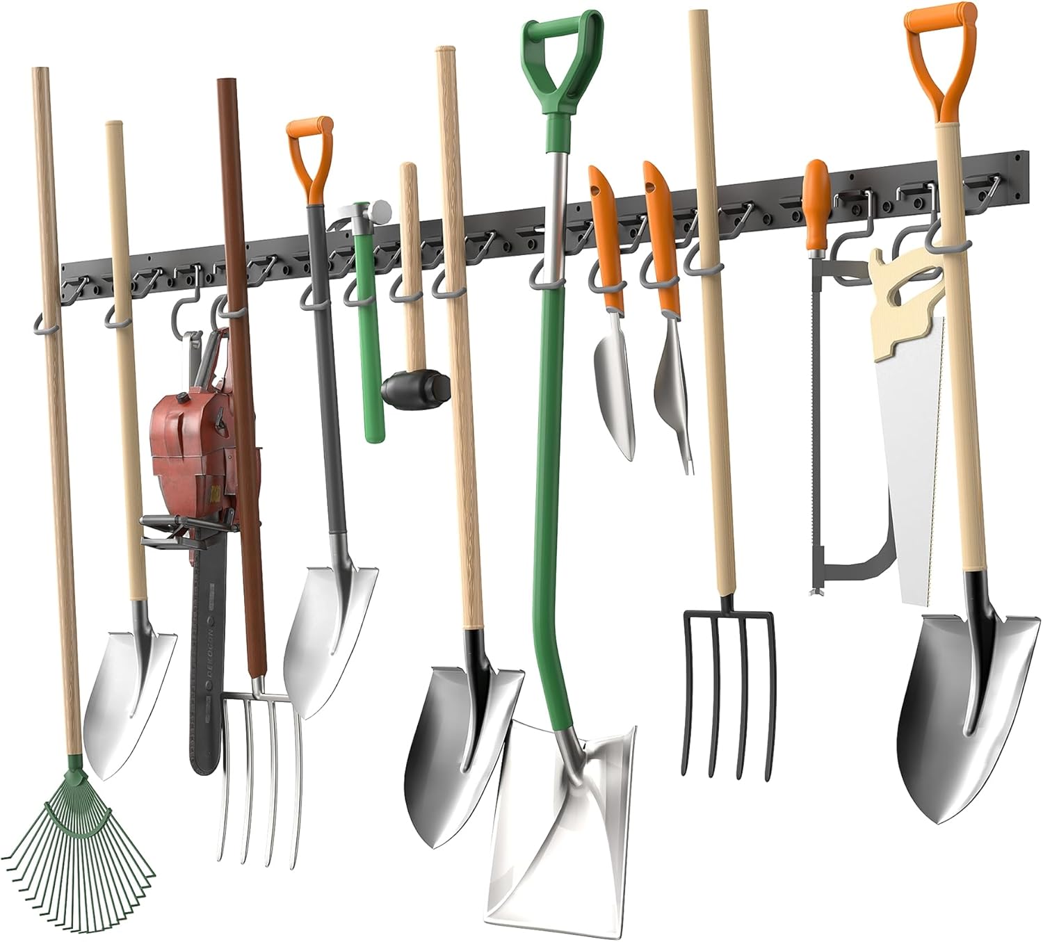 Wall-Mounted Tool Organizer: Declutter your garage or shed with this efficient wall-mounted tool storage rack—perfect for organizing rakes, shovels, brooms, mops, and more in one tidy space