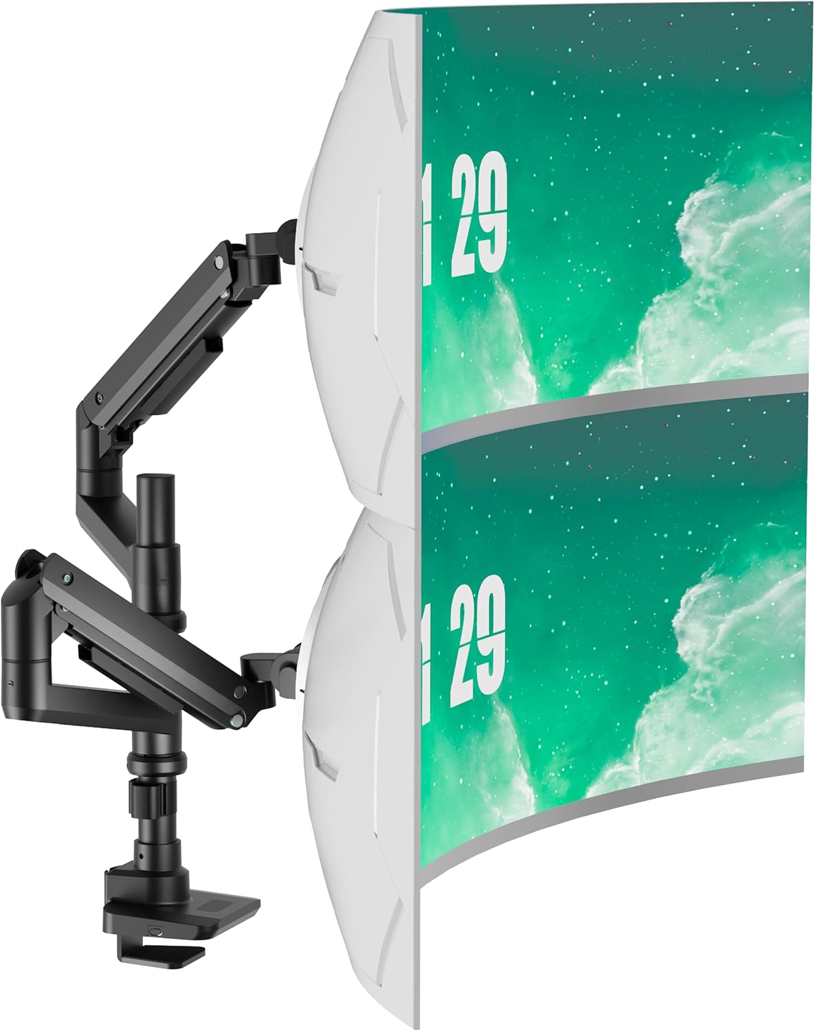 Stack Monitor Mount – Fully Adjustable: Dual Monitor Mounts with a stable gas spring, it offers a screen tilt of -50° to +20°, +/-90° swivel, and 360° rotation. This height flexibility in the monitor stand allow for various screen stacking ways, and 18.9” of smooth height adjustment with gas spring lift.