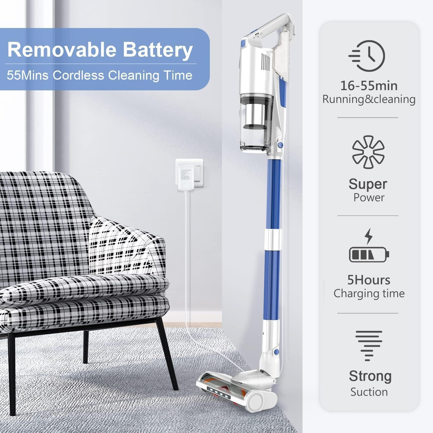 【LARGE BATTERY FOR LONG RUNTIME】The cordless vacuum cleaner with a large-capacity battery provides up to 55 mins of daily cleaning in the standard mode, the running time is more longer, and MAX mode provides 16 mins of deep cleaning. It can be charged on the wall mount to save storage space.