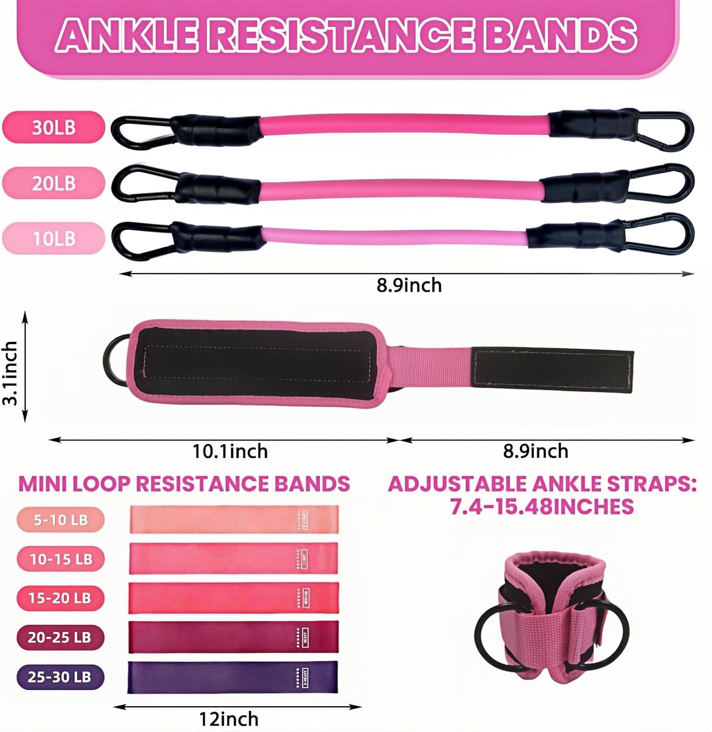 【3 Ankle Bands + 5 Elastic Bands】Includes 3 cuffed ankle bands (10/20/30lbs) and 5 loop resistance bands (5/10/15/20/30lbs) for full lower body toning.