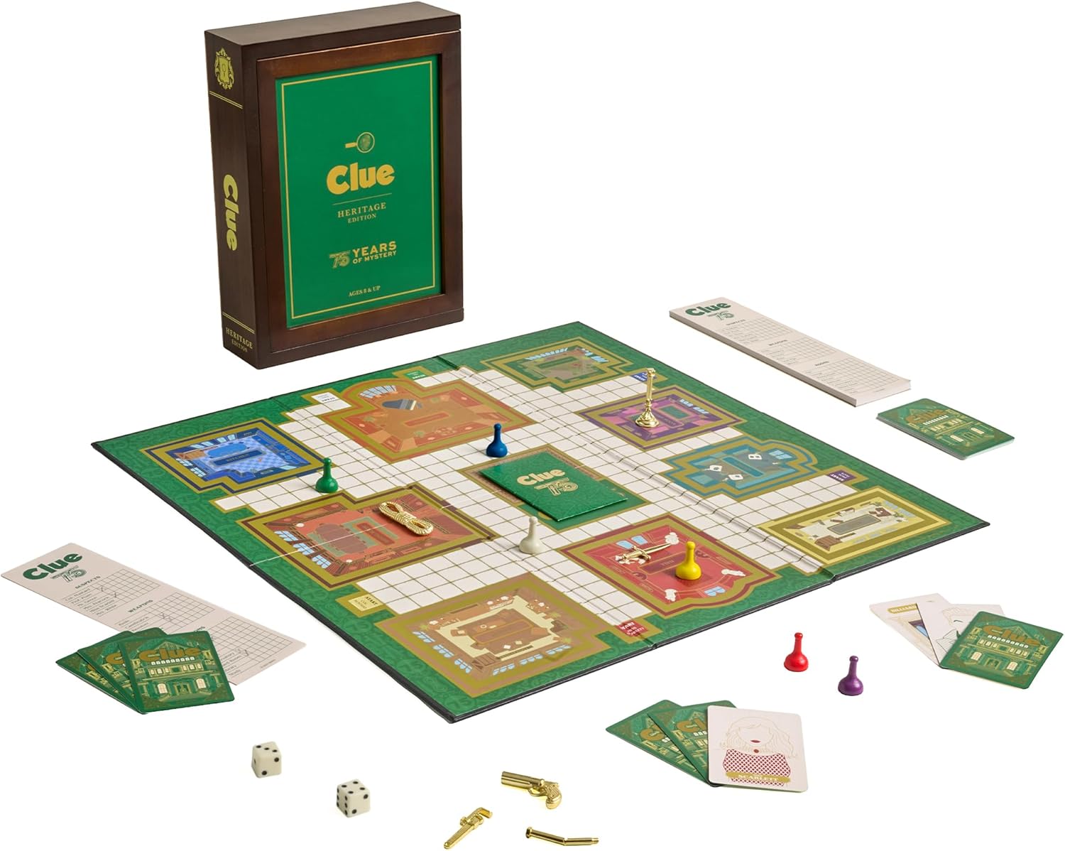Elegant Design: The CLUE Heritage Edition comes in a stunning walnut-stained wooden game box, beautifully crafted for both style and functionality. Integrated storage keeps your game components organized, ensuring you’ll be ready for your next mystery at a moment’s notice.