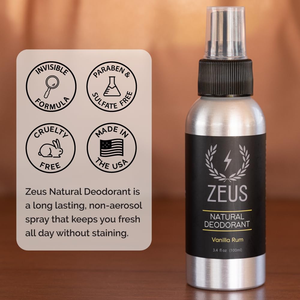 BODY SPRAY DEODORANT: Our 3.4 oz. ZEUS Natural Deodorant Body Spray provides fast absorbing freshness and comfort without drying your skin. Naturally formulated with all skin types in mind.